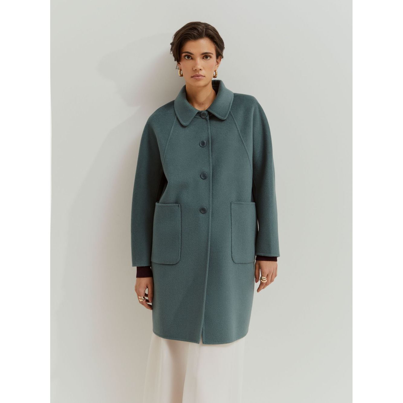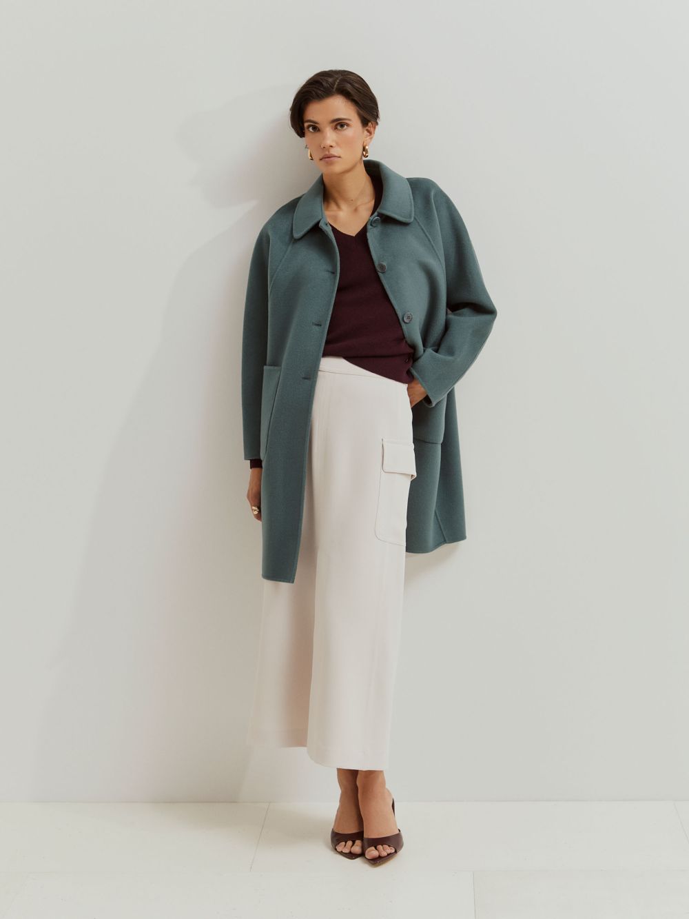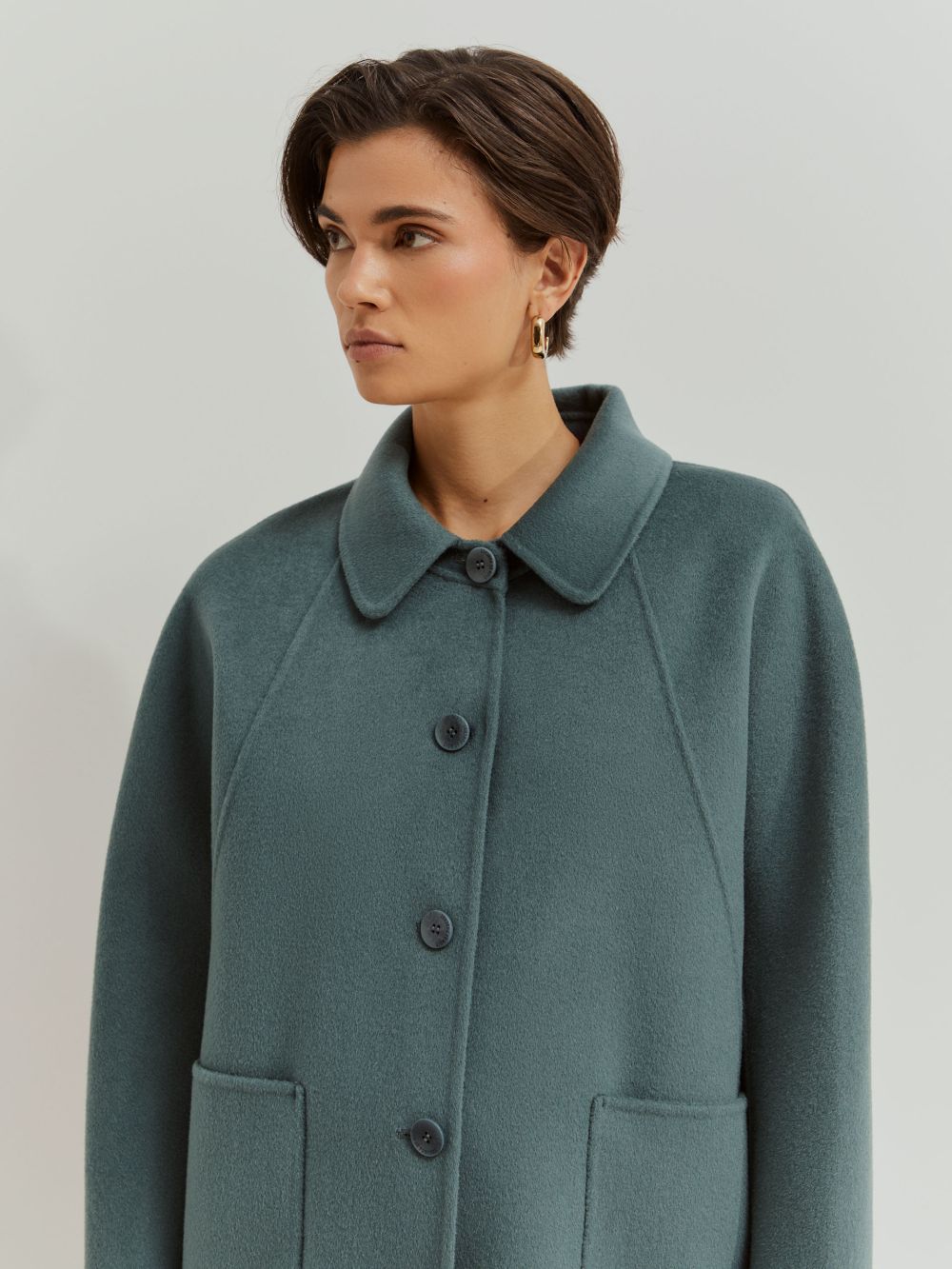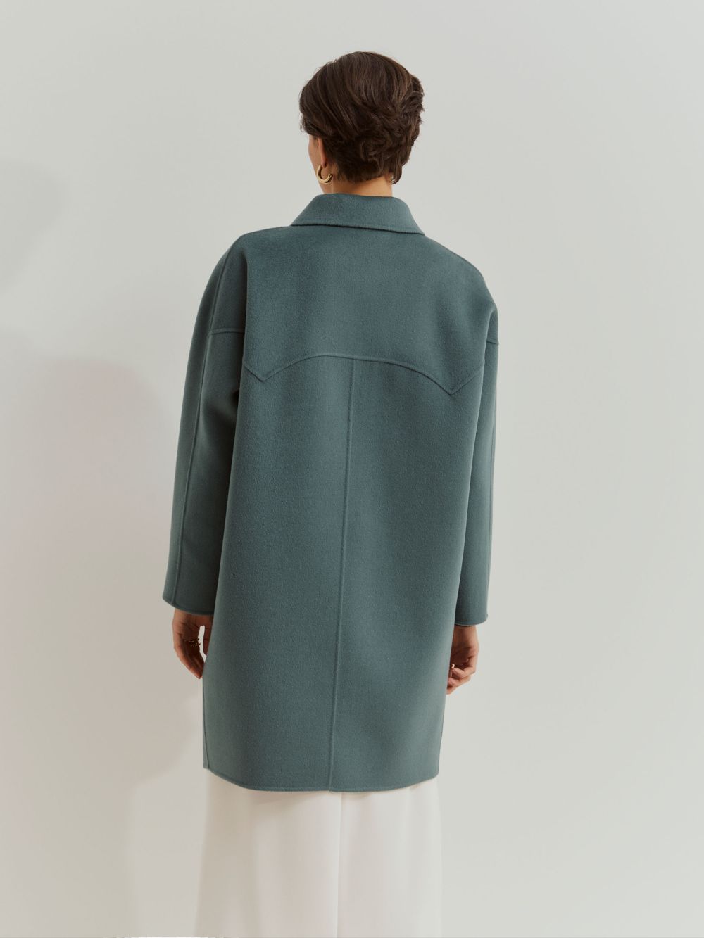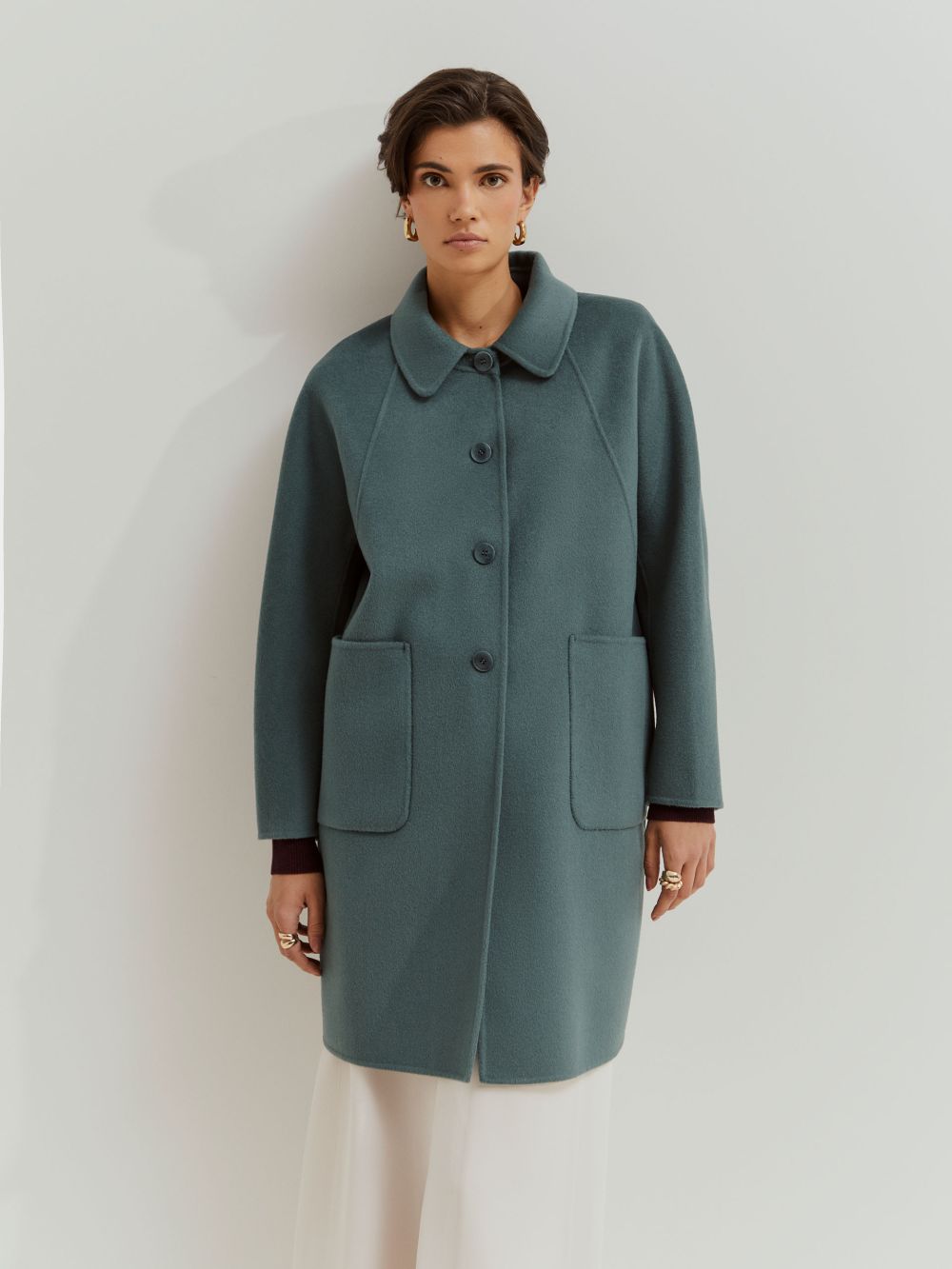 Abrigo de lana regular fit con un diseño recto y minimalista. Se abrocha con tres botones en la parte delantera para un aspecto limpio y elegante. Una prenda versátil y atemporal, perfecta para los días fríos con un estilo discreto. Color verde.