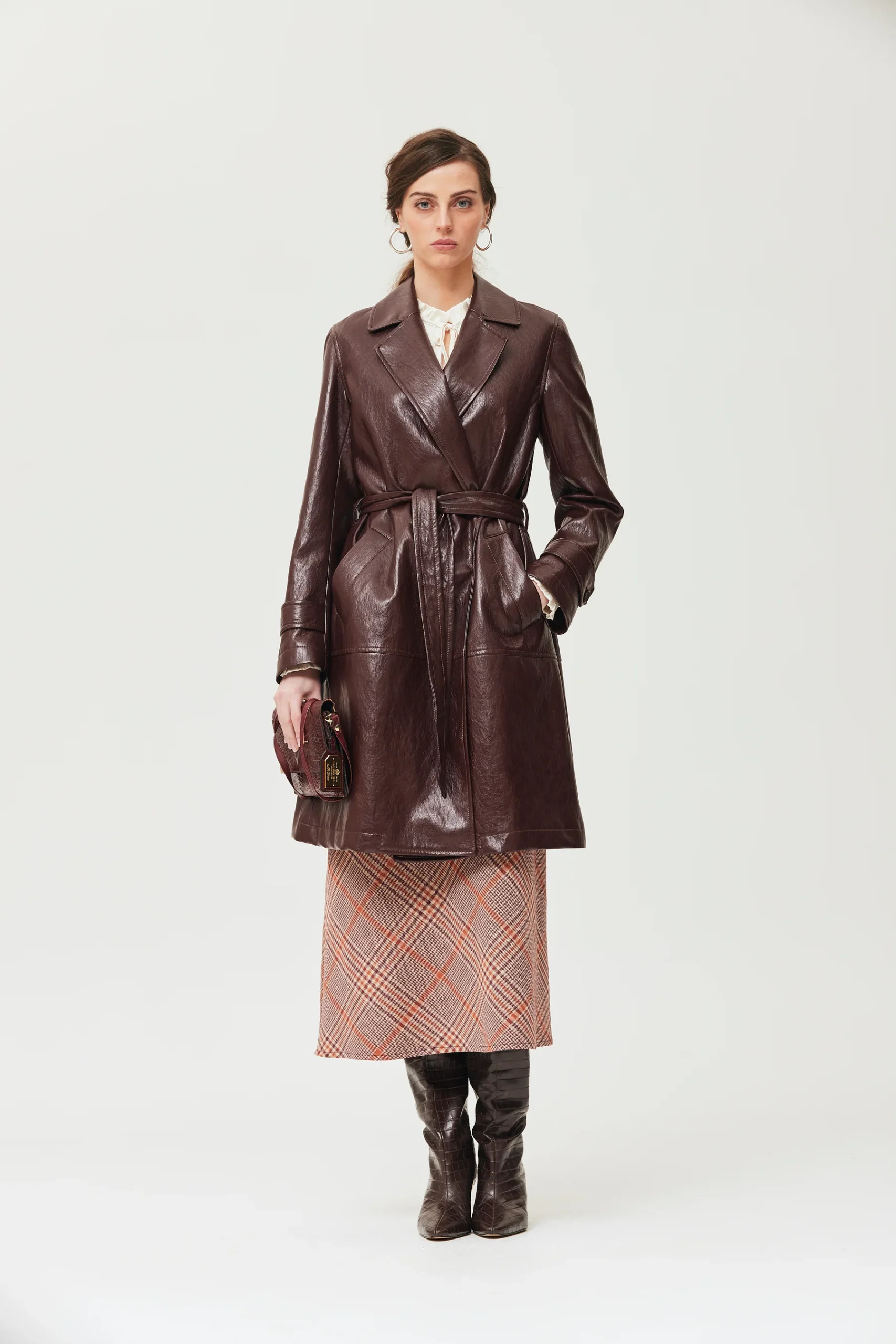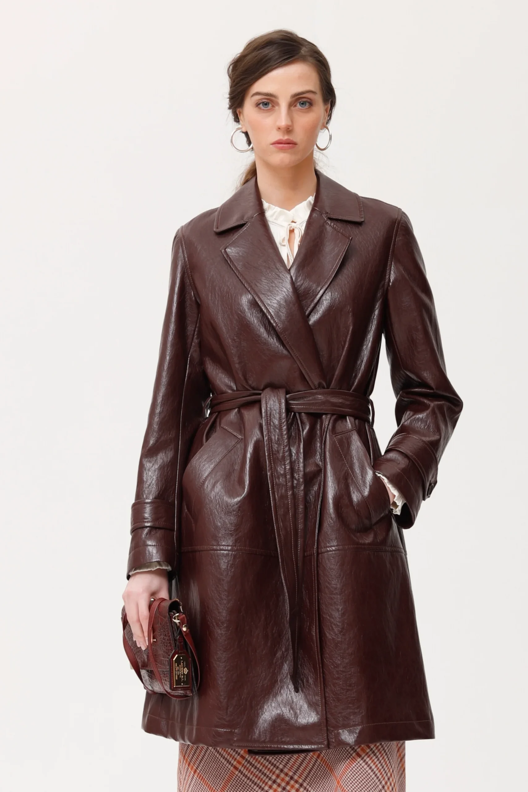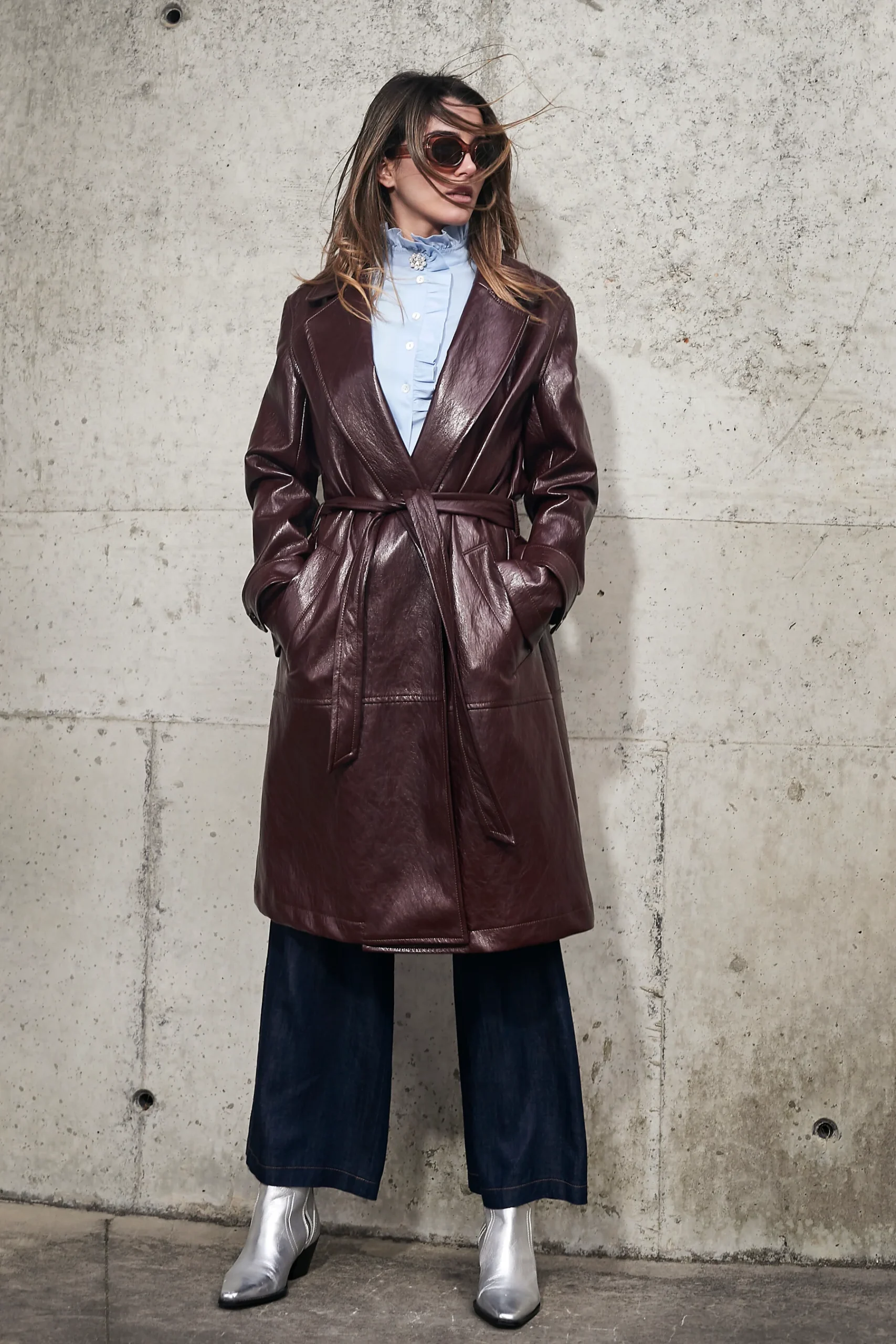 Abrigo efecto piel de solapa amplia, bolsillos y cinturon. Color granate.