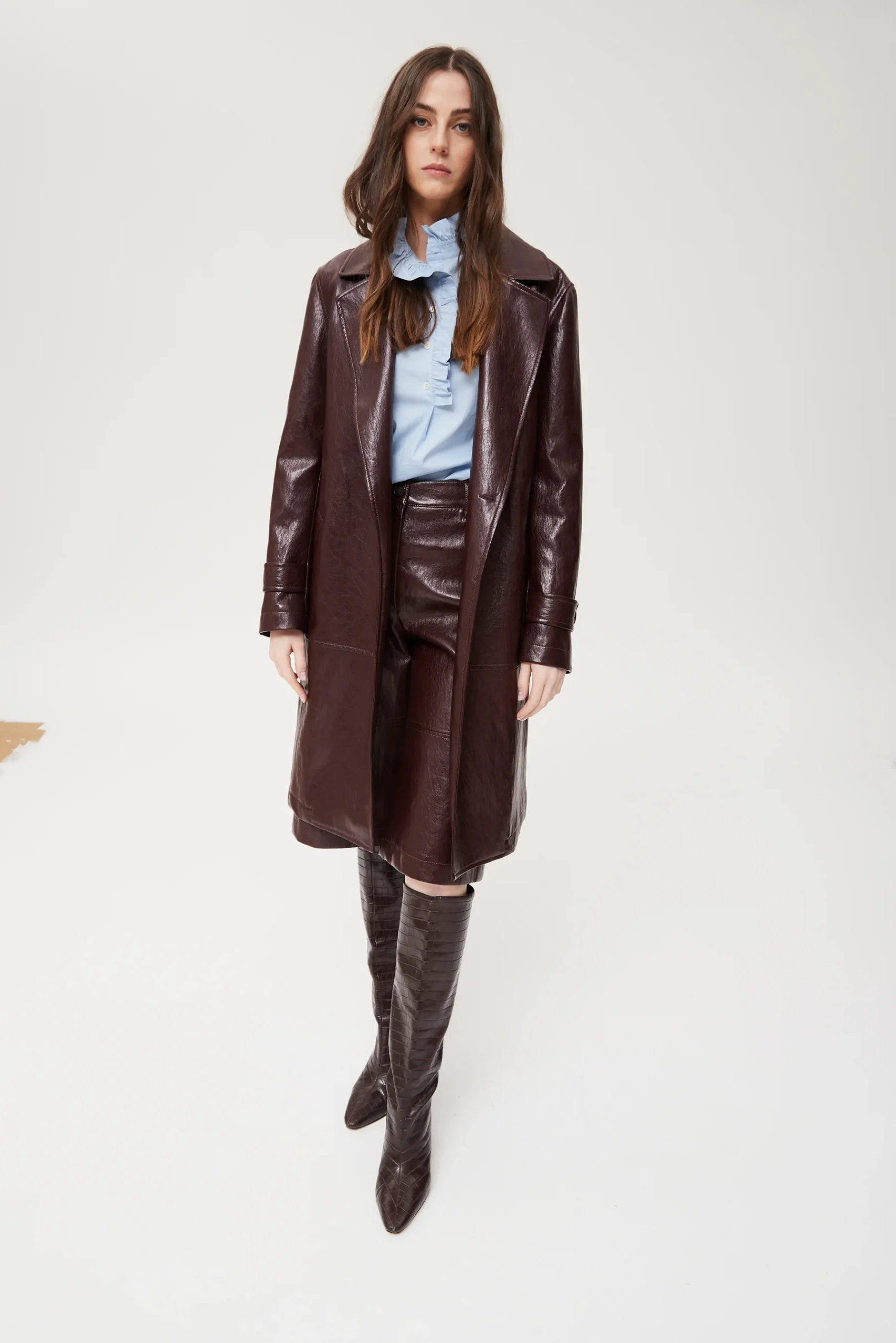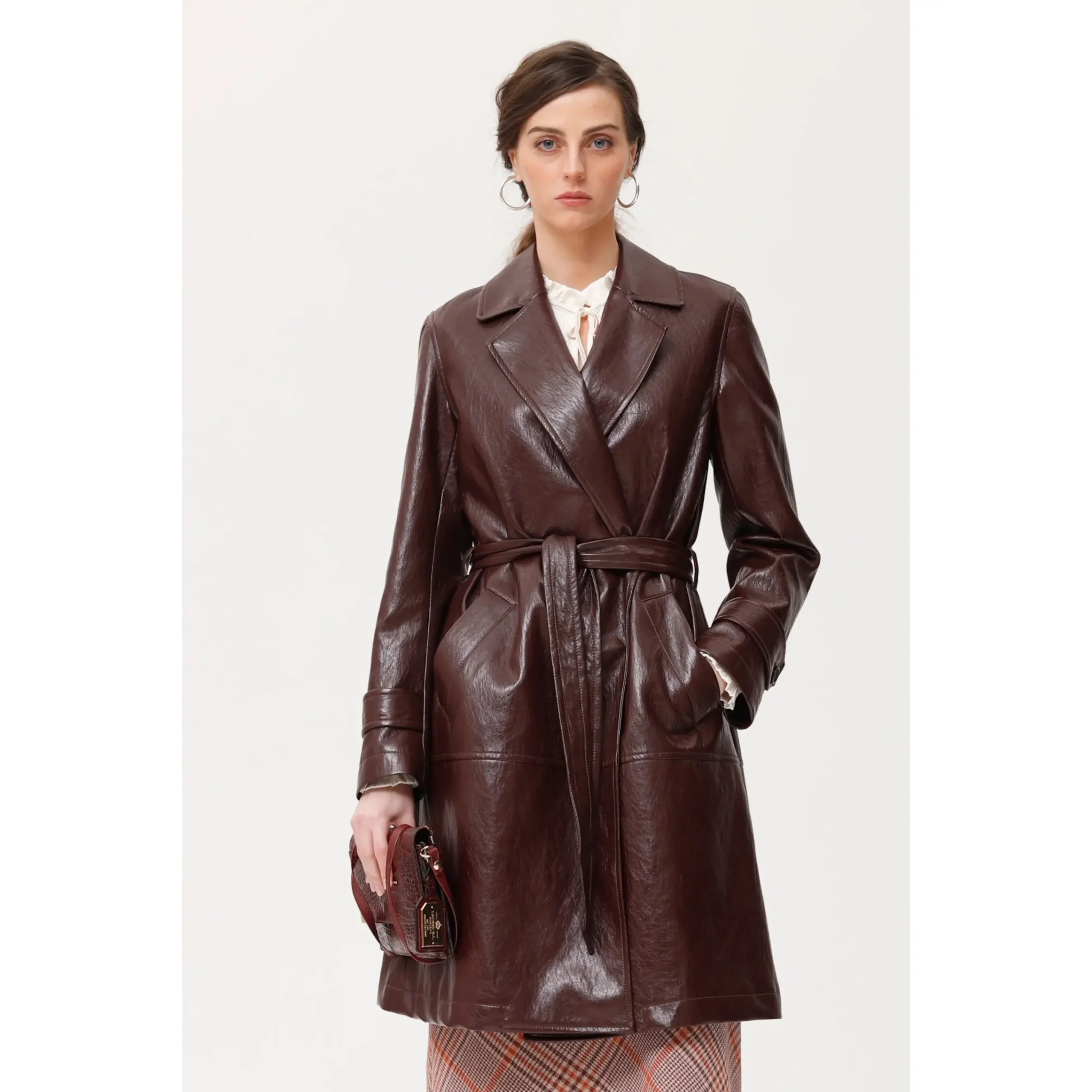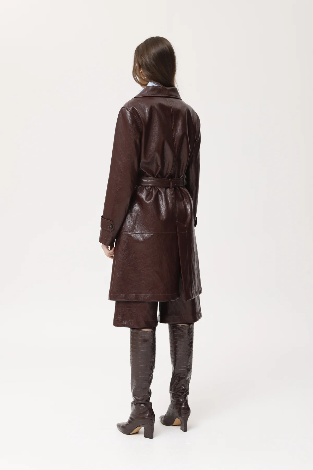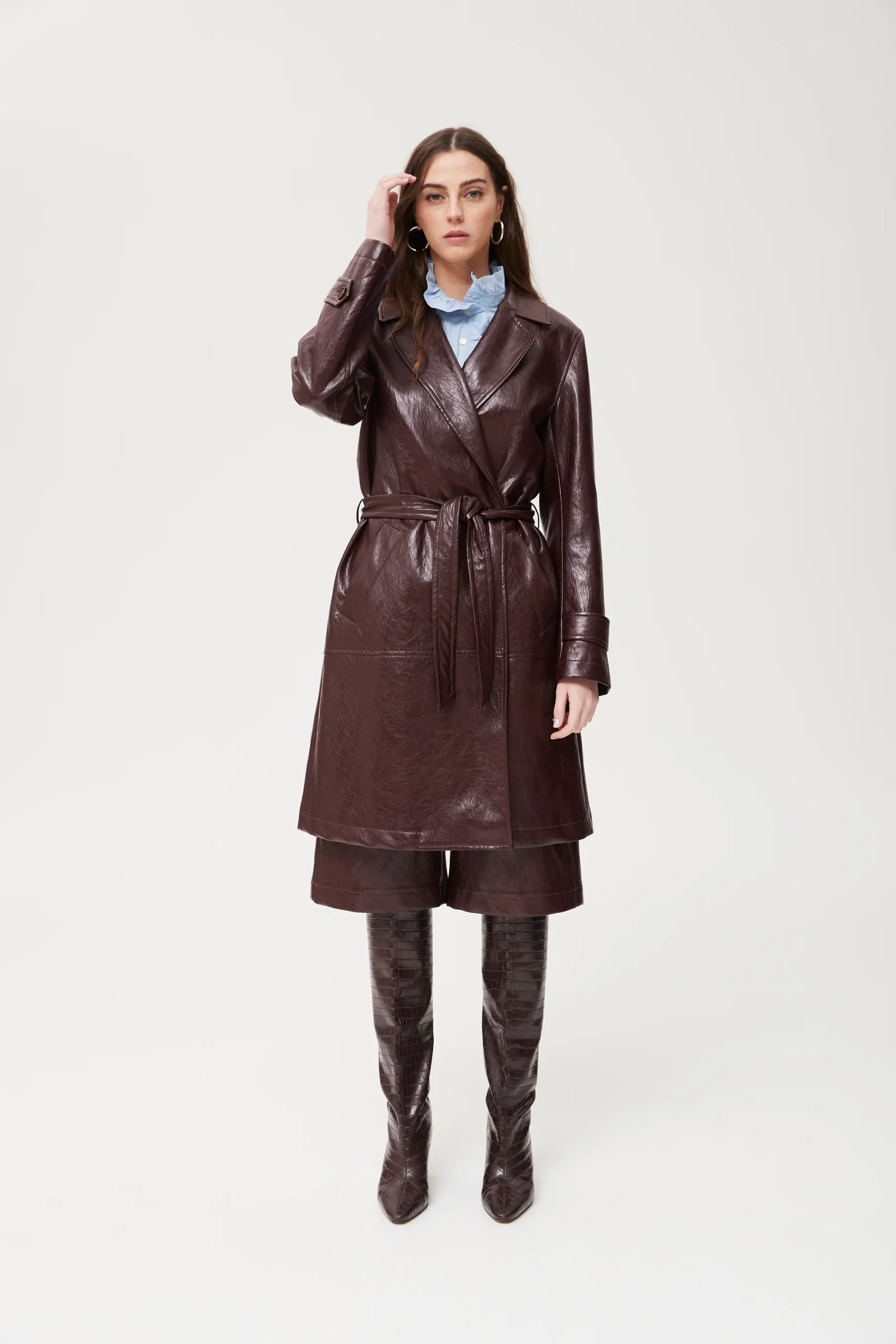 Abrigo efecto piel de solapa amplia, bolsillos y cinturon. Color granate.