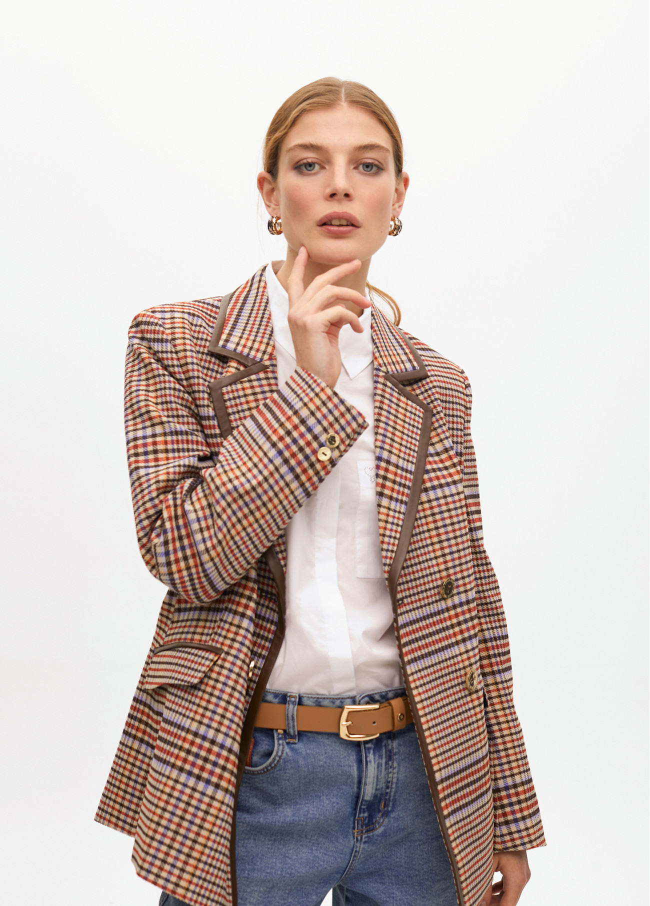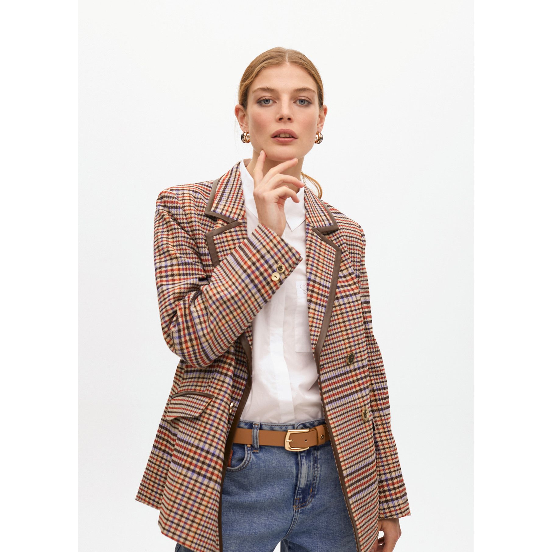 Elegante americana cruzada con diseño de cuadros y ribete de contraste. Confeccionada en tejido suave y resistente. Botonadura doble y bolsillos frontales integrados.