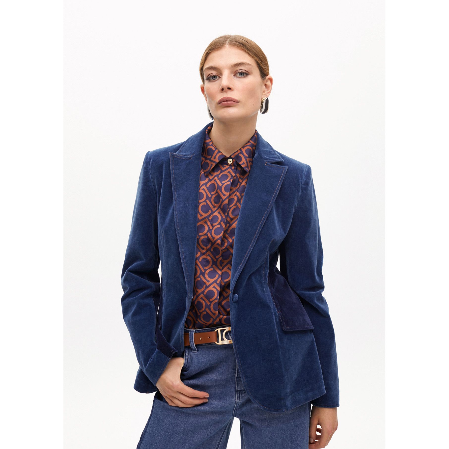 Americana entallada de denim con acabado en terciopelo suave. Presenta detalles en los laterales que realzan la figura. Cierre de botón frontal y solapa clásica. Perfecta para un look sofisticado y moderno.