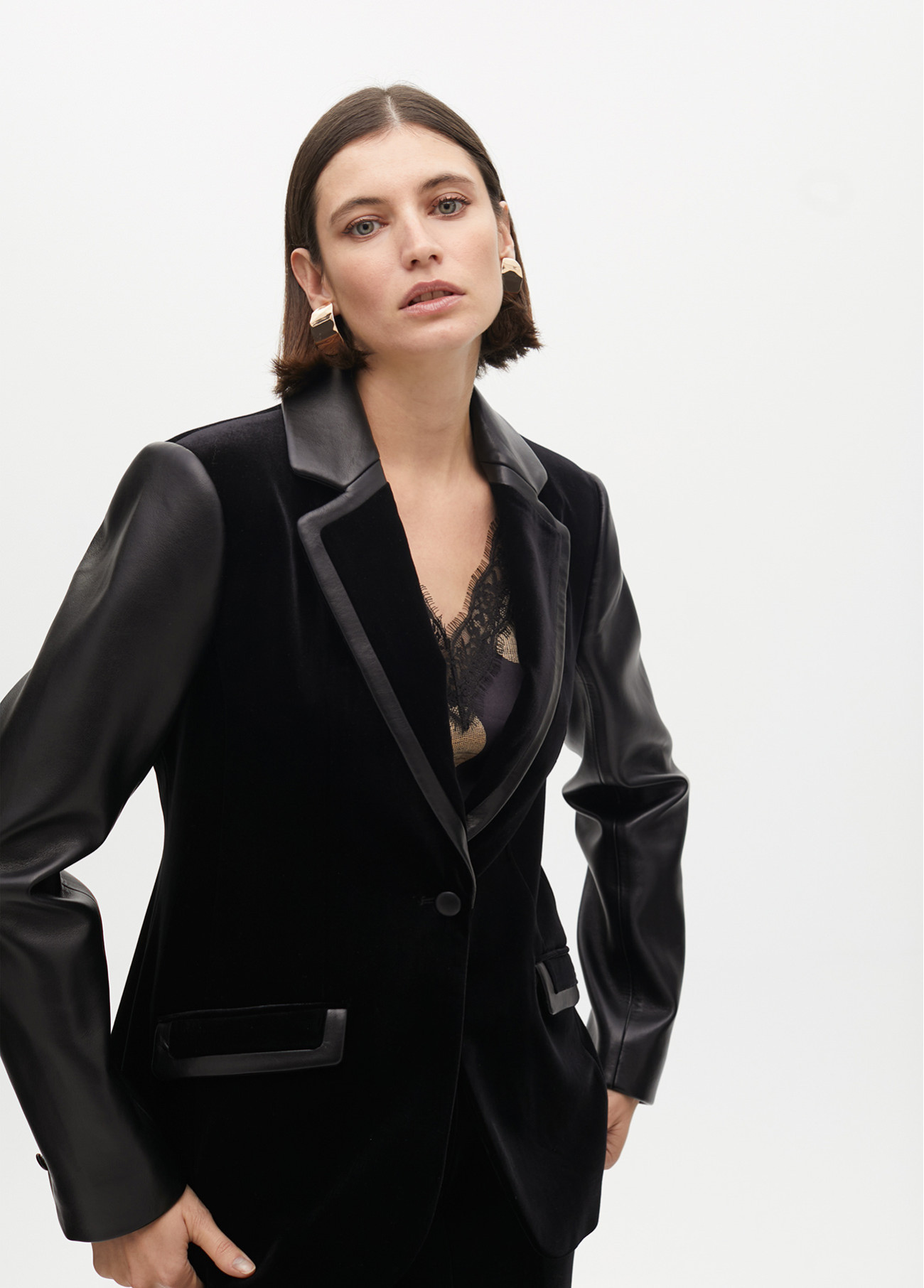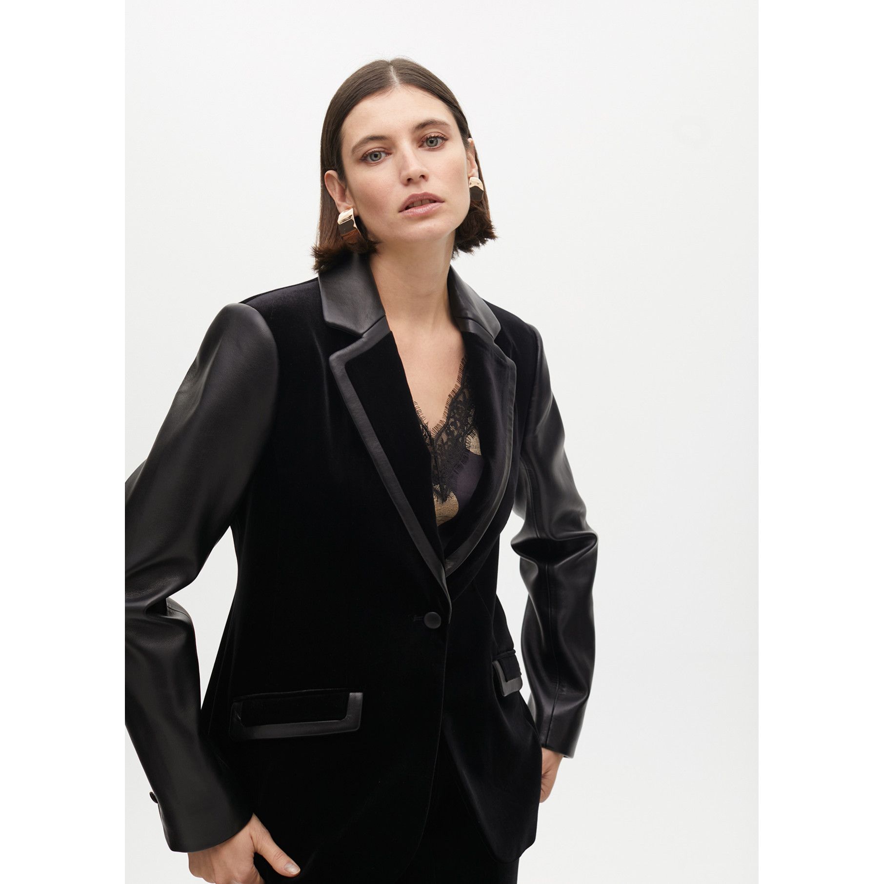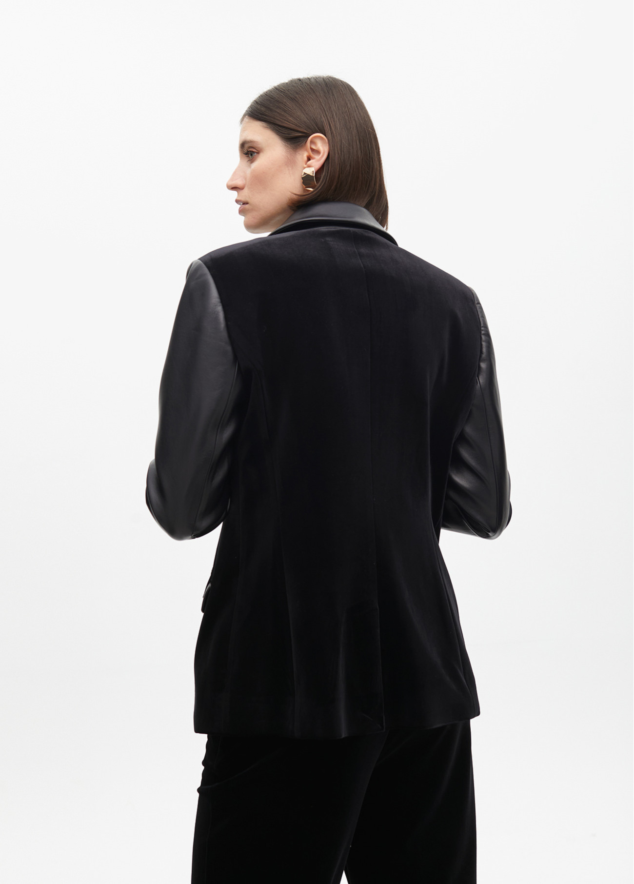 Americana entallada de terciopelo con sofisticados detalles en efecto piel. Cuello de solapa y mangas largas combinadas. Cierre frontal de un botón y bolsillos decorativos en la parte delantera. Ideal para un look elegante y moderno.