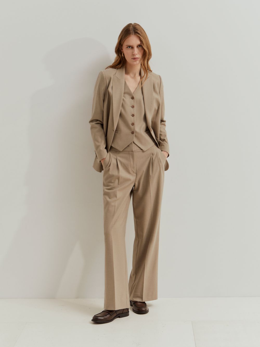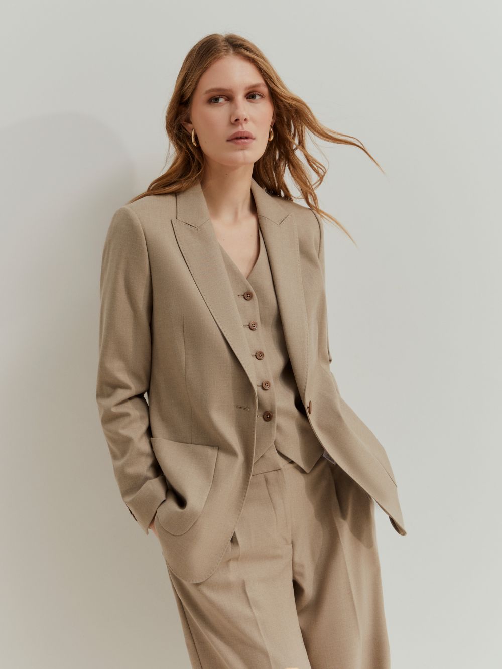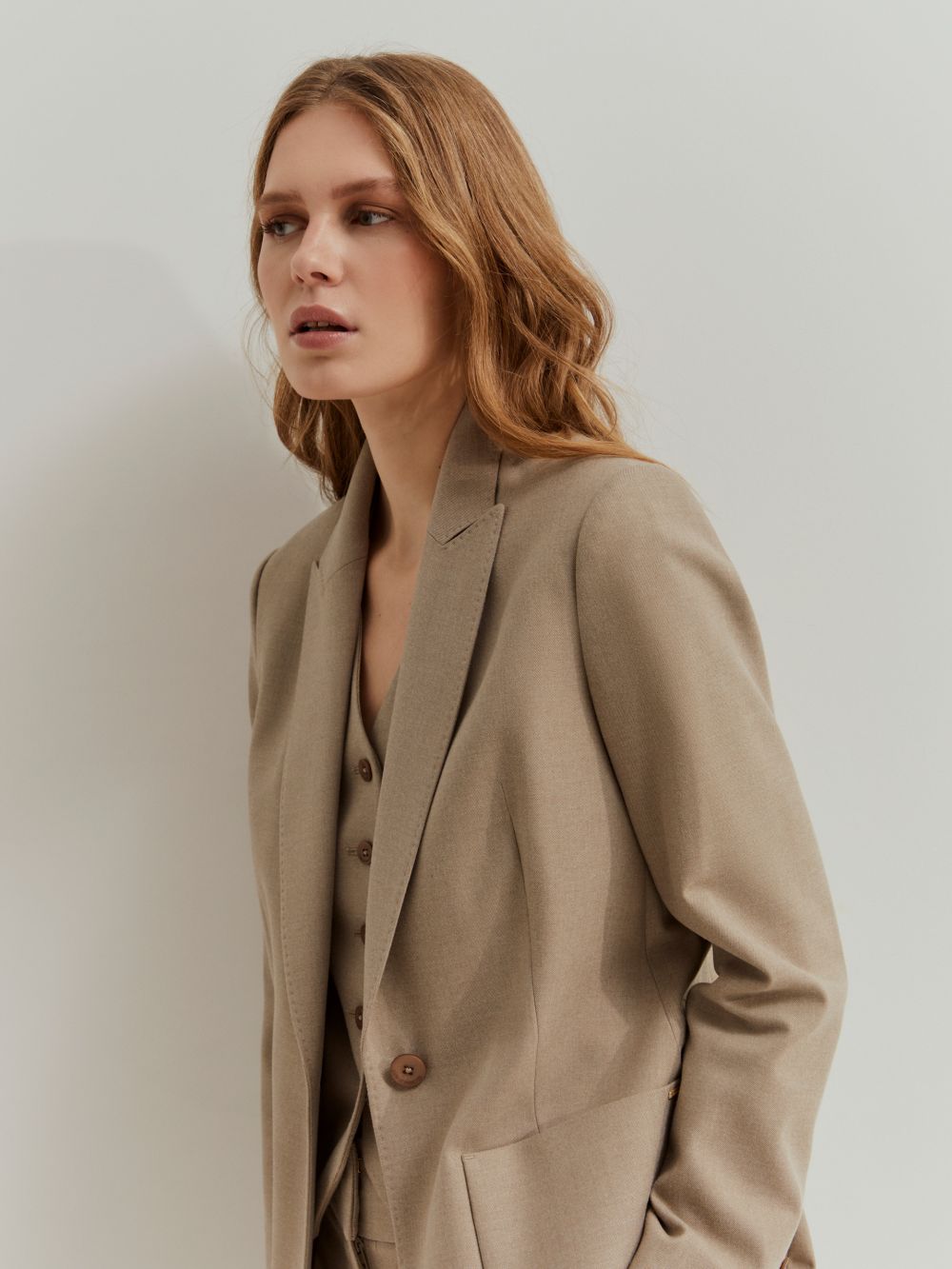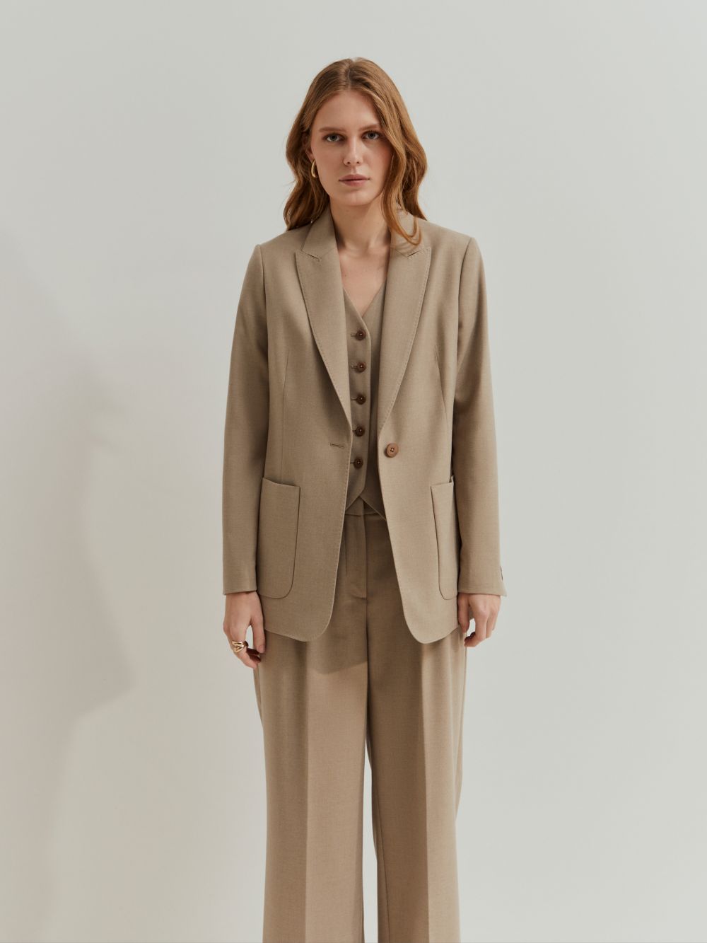Con un corte regular fit, esta chaqueta clásica se abrocha con un solo botón, realzando una silueta elegante y atemporal. Confeccionada con una mezcla de tejidos que garantizan comodidad y libertad de movimientos, es una prenda versátil para uso profesional o informal. Se puede combinar con pantalones anchos para crear un conjunto coordinado y sofisticado. Color beige.
