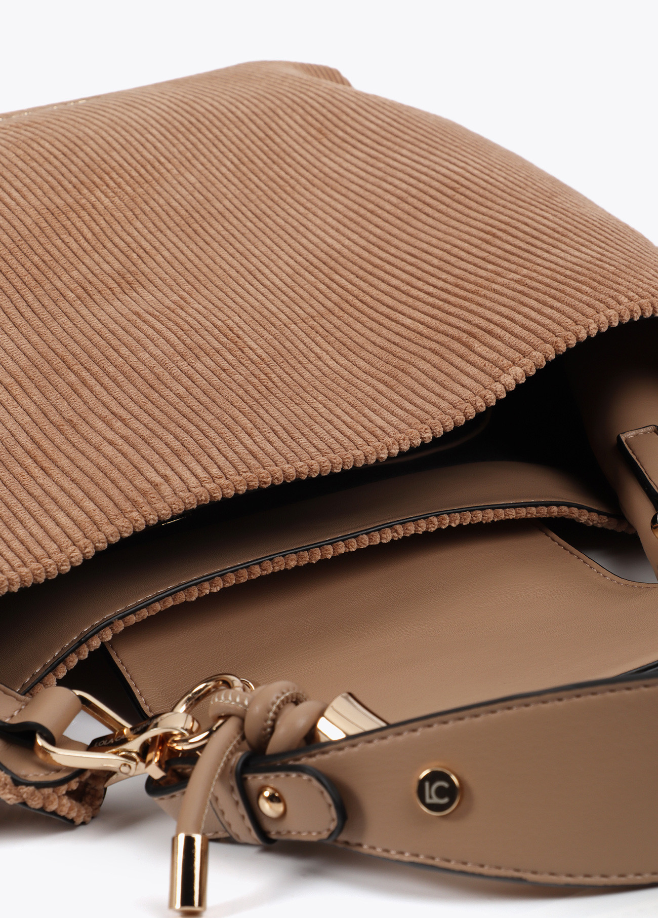 Elegante bolso shopper con tejido acanalado y asa metalizada con logo personalizado. Incluye detalles trenzados laterales y cierre magnético. Espacioso interior, ideal para el día a día. Color beige.