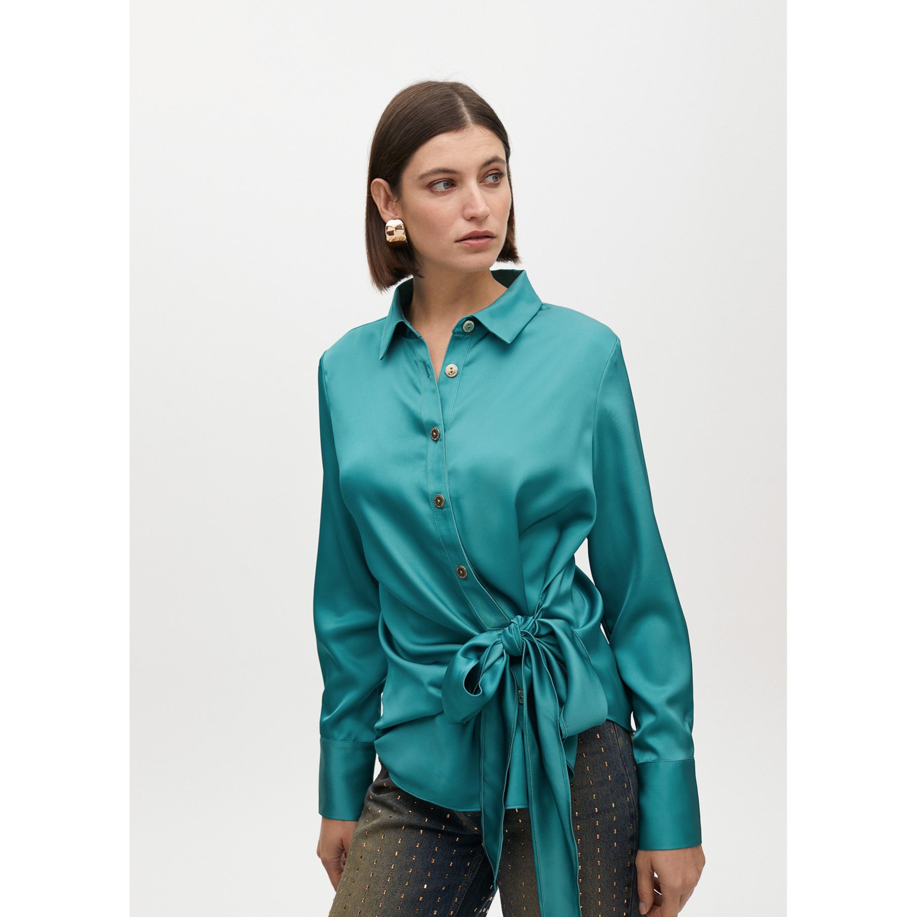 Camisa elegante con cuello clásico y llamativo nudo en el bajo. Confeccionada en material sedoso, botones frontales y puños dobles. Versátil para cualquier ocasión con un color vibrante que resalta.