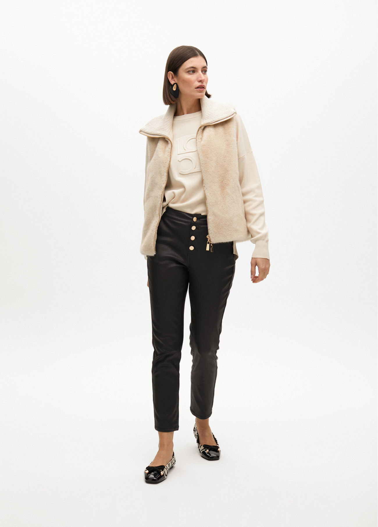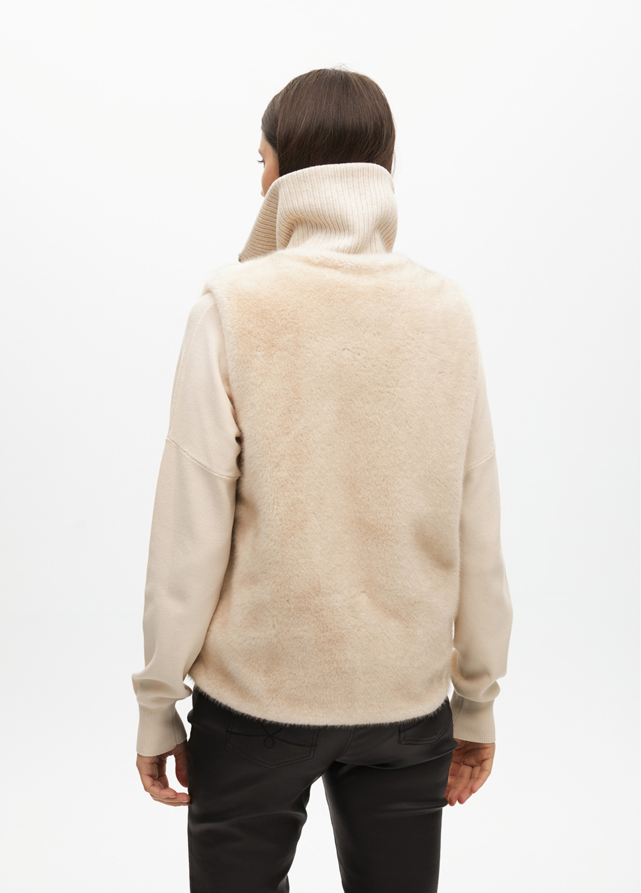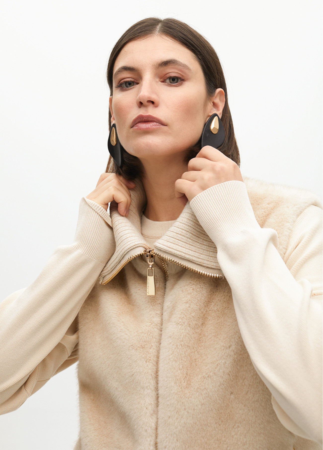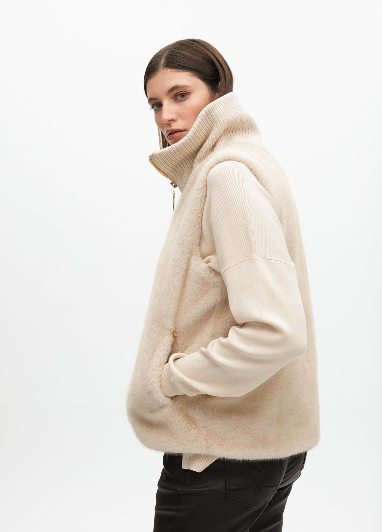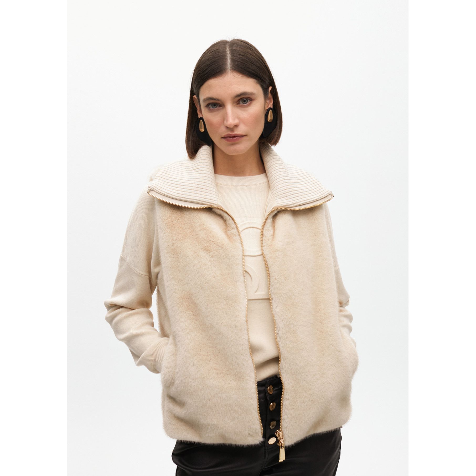 Chaleco de pelo corto en color beige con cremallera frontal. Cuello elevado de canalé para mayor confort. Diseño sin mangas, ideal para combinar con ropa de temporada. Logotipo distintivo en cremallera.