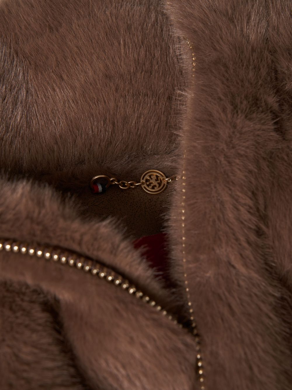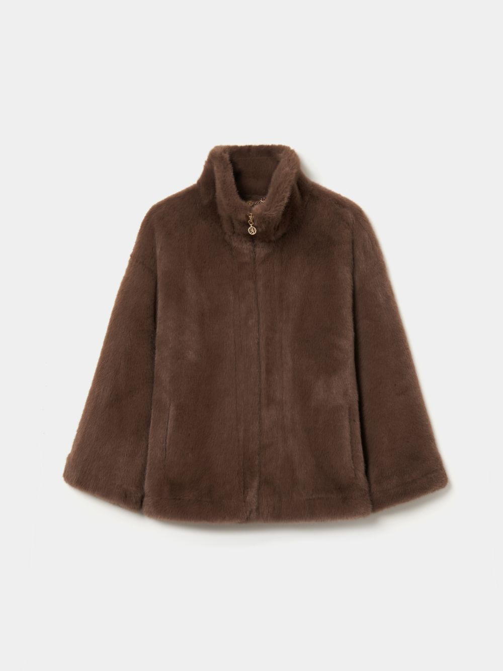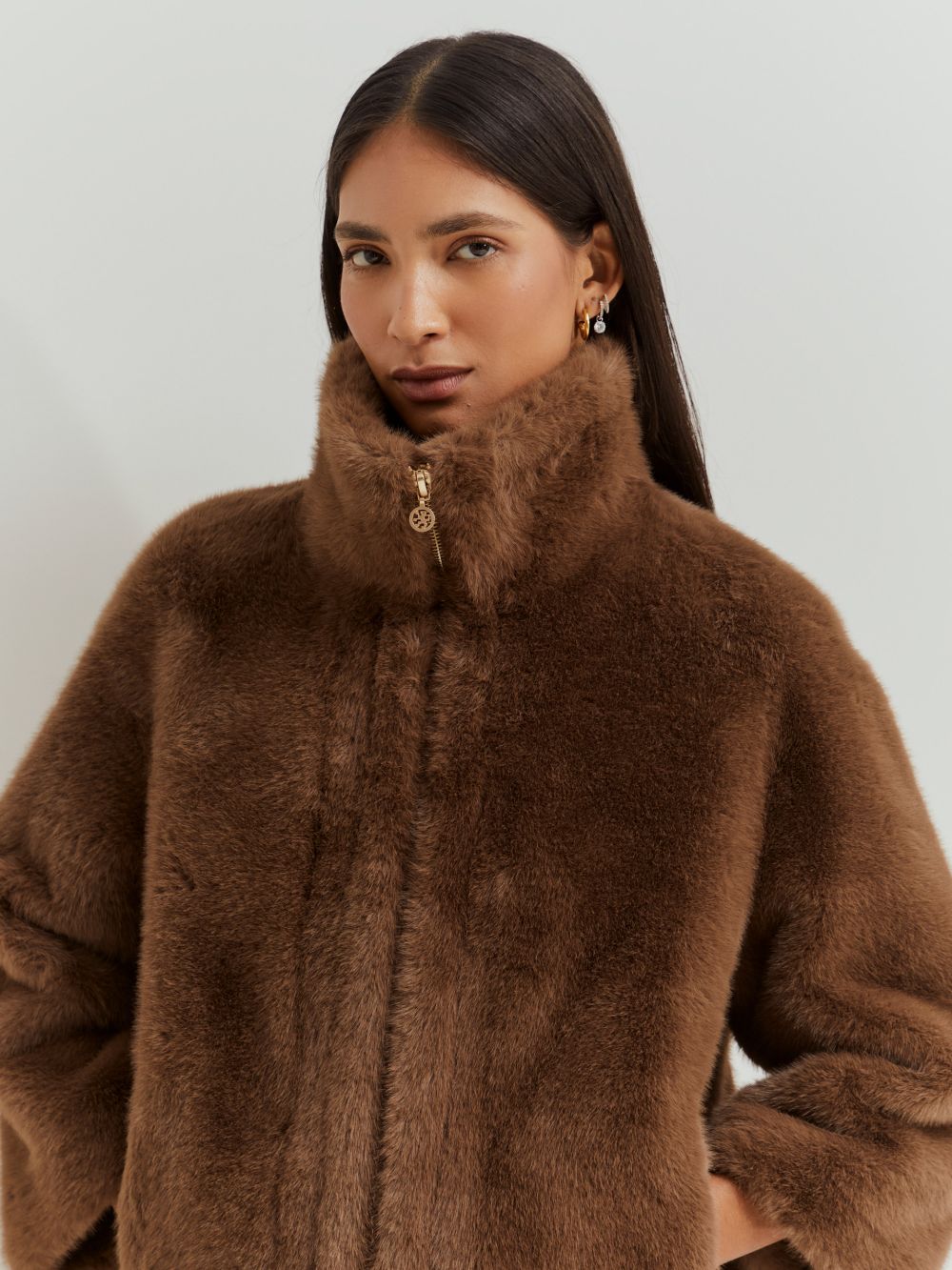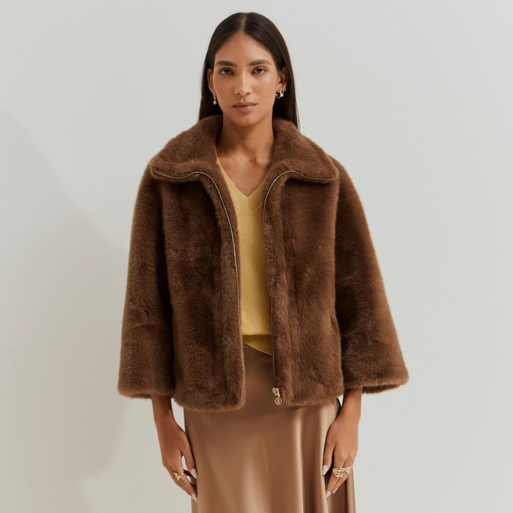 Este abrigo de pelo sintético destaca por sus mangas raglán, que le confieren un corte desenfadado y elegante. La cremallera frontal se realza con el exclusivo detalle del león de la marca, lo que lo convierte en una prenda distintiva y sofisticada. Color marrón dorado.