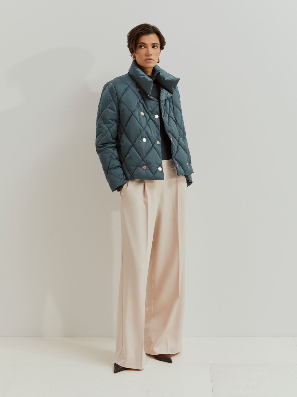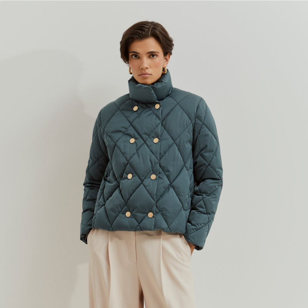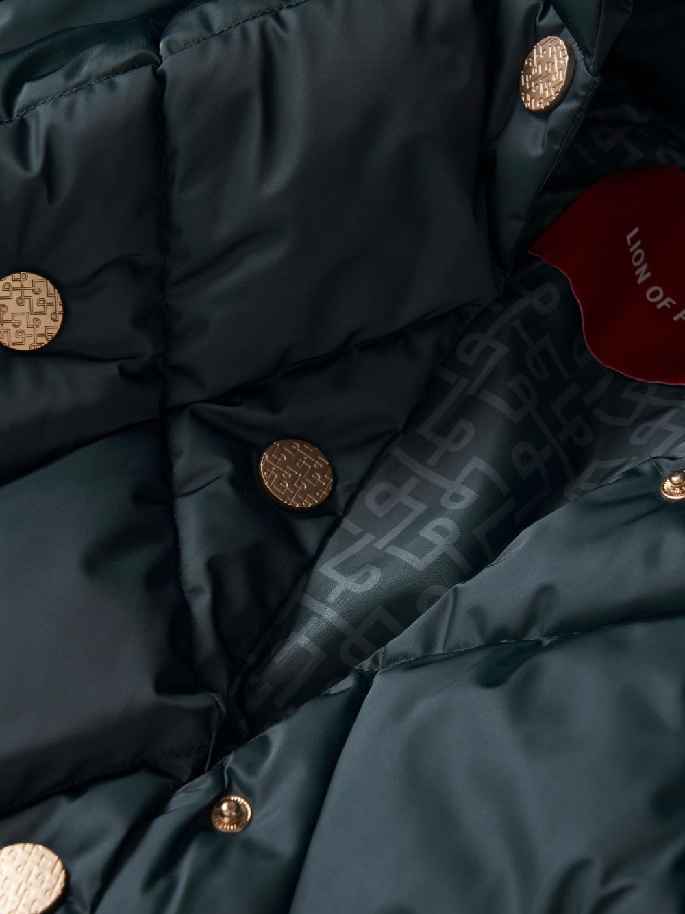 Chaqueta acolchada con doble botonadura, perfecta para protegerse con elegancia en los días más fríos del invierno. Cierre de doble botonadura con corchetes automáticos personalizados con el monograma de la marca. Forro interior también con monograma LP. Terminado con bolsillos en las costuras laterales. Color verde.