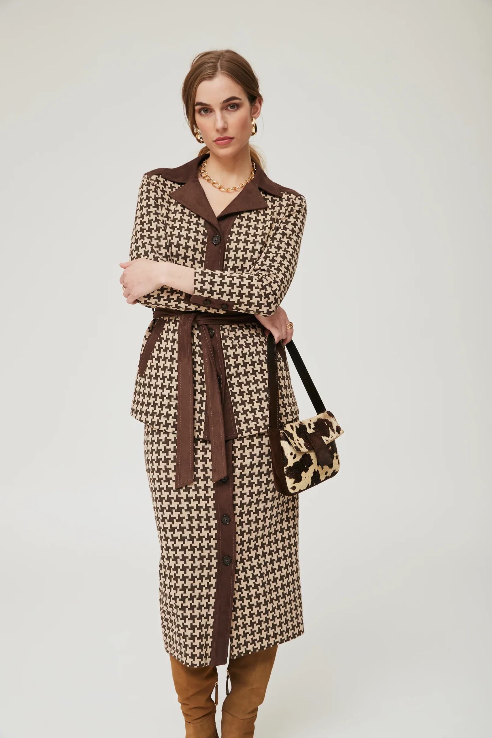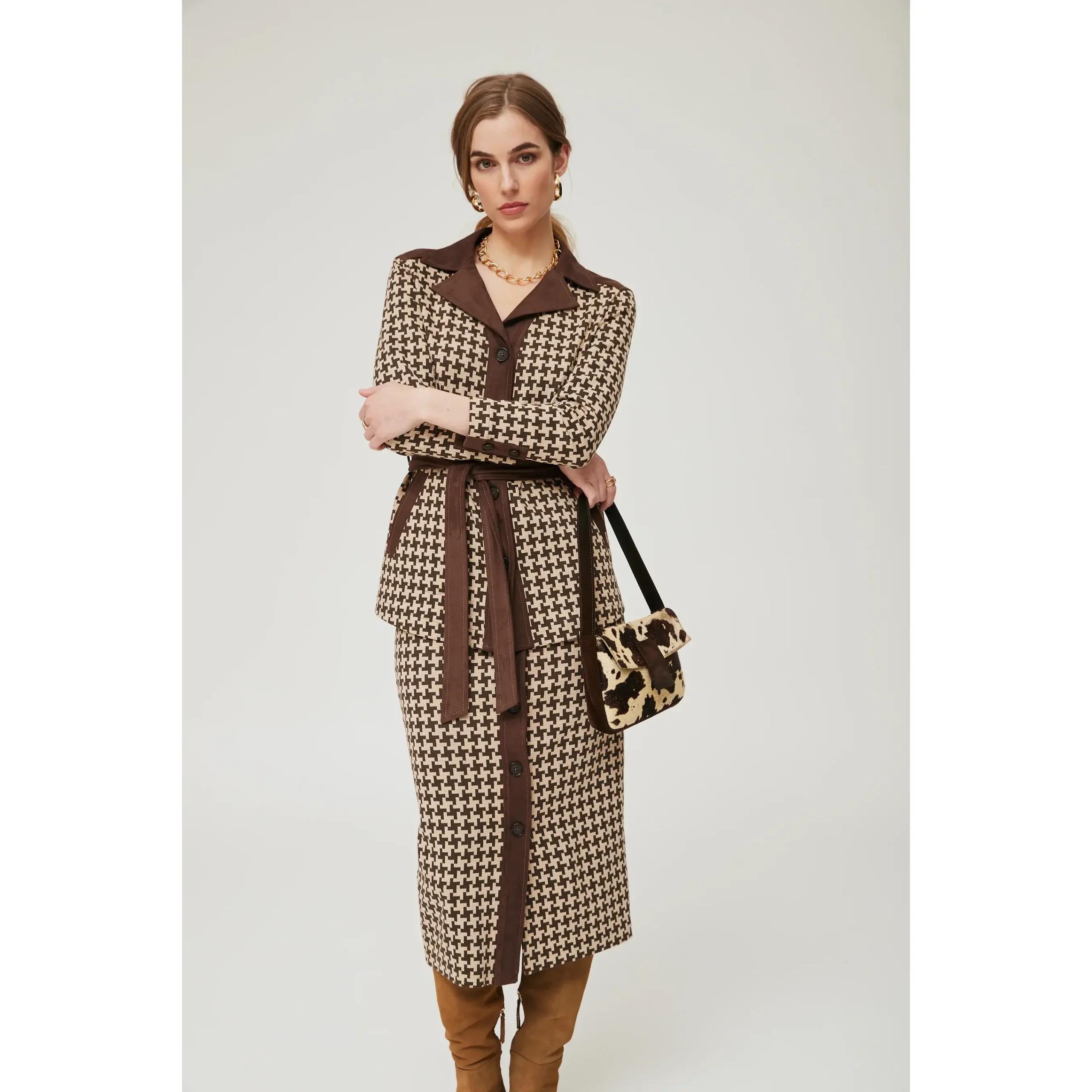 Falda midi recta en jacquard de punto bicolor, con falsa botonadura en delantero. Color marrón y beige.