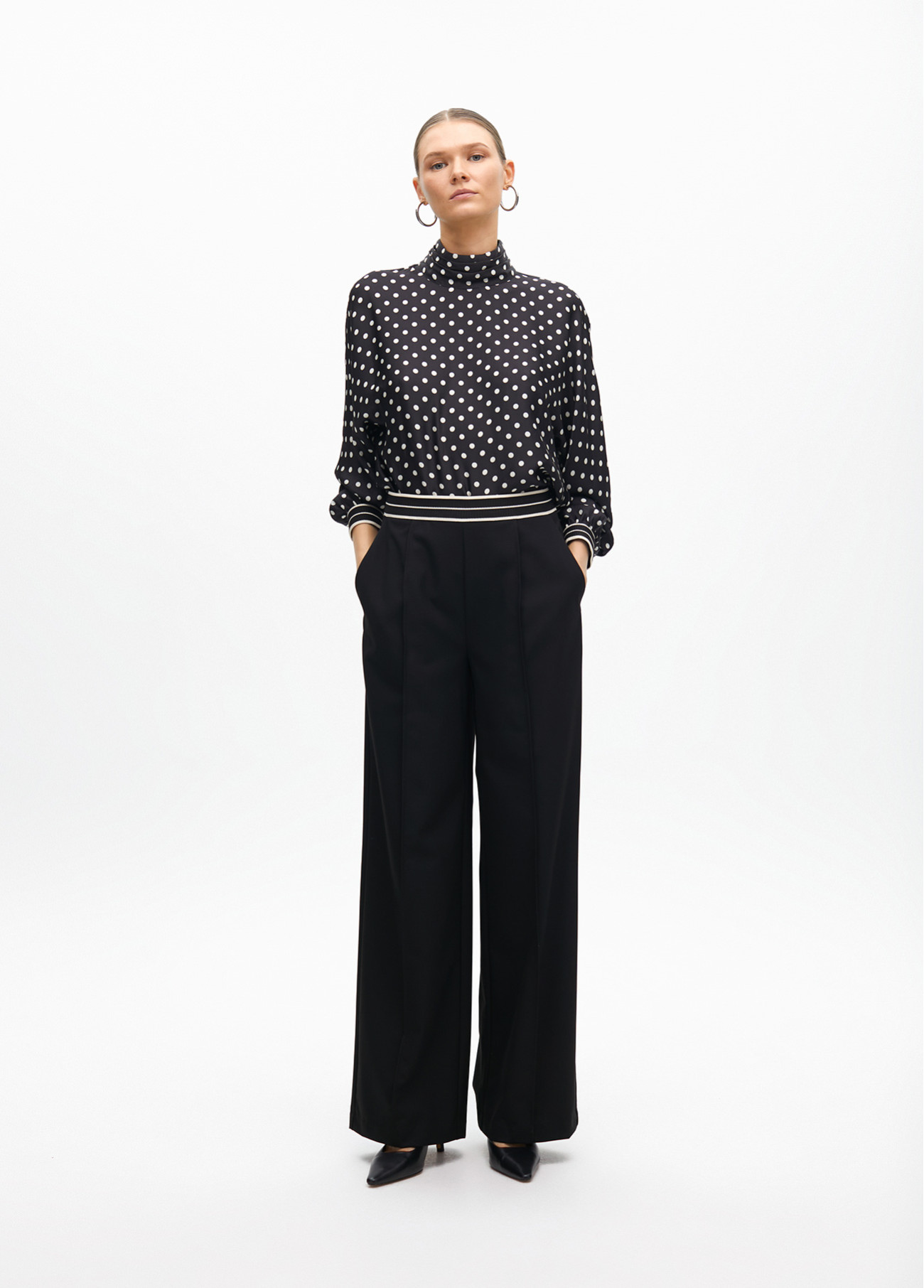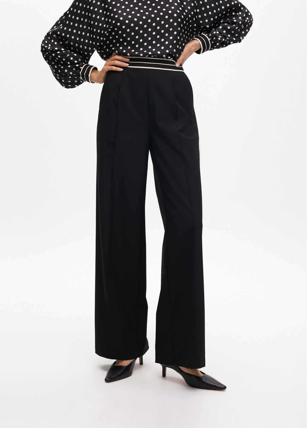 Pantalón recto con elegante diseño bicolor. Cintura elástica para un ajuste cómodo. Detalles de contrastes que aportan un toque moderno y sofisticado. Color negro, combinado en crudo en elástico de la cintura.