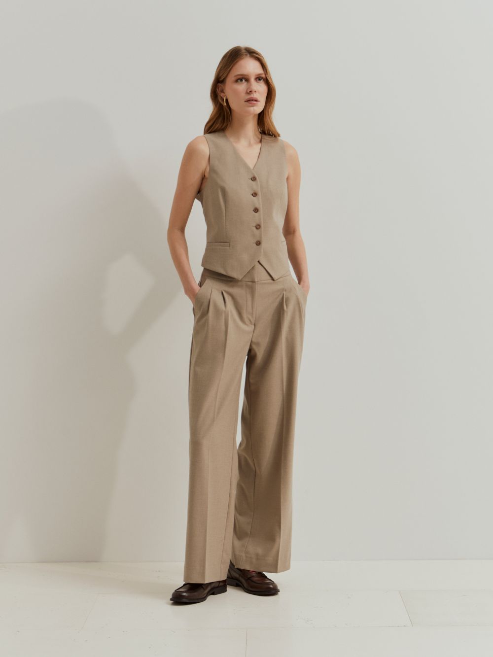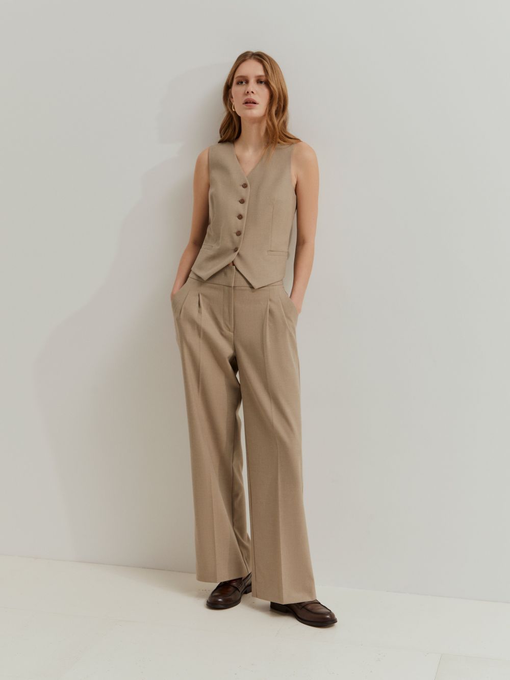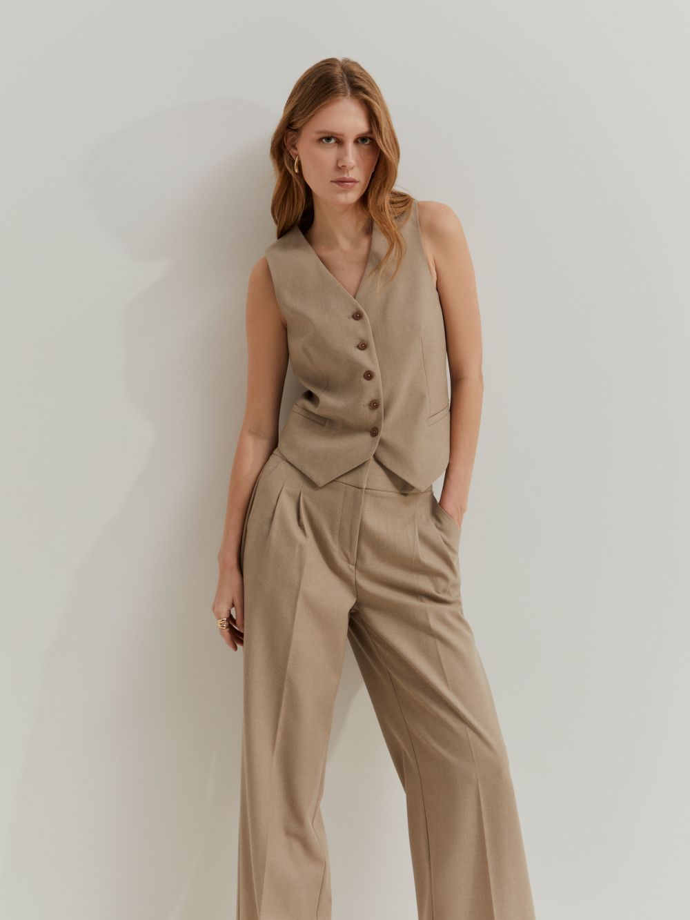 Pantalones con pinza delantera que alargan la silueta y transmiten sofisticación. El corte fluido garantiza la comodidad, mientras que el design versátil permite crear desde looks profesionales hasta combinaciones casuales y modernas. Una prenda clave para un armario elegante y funcional. Color beige.