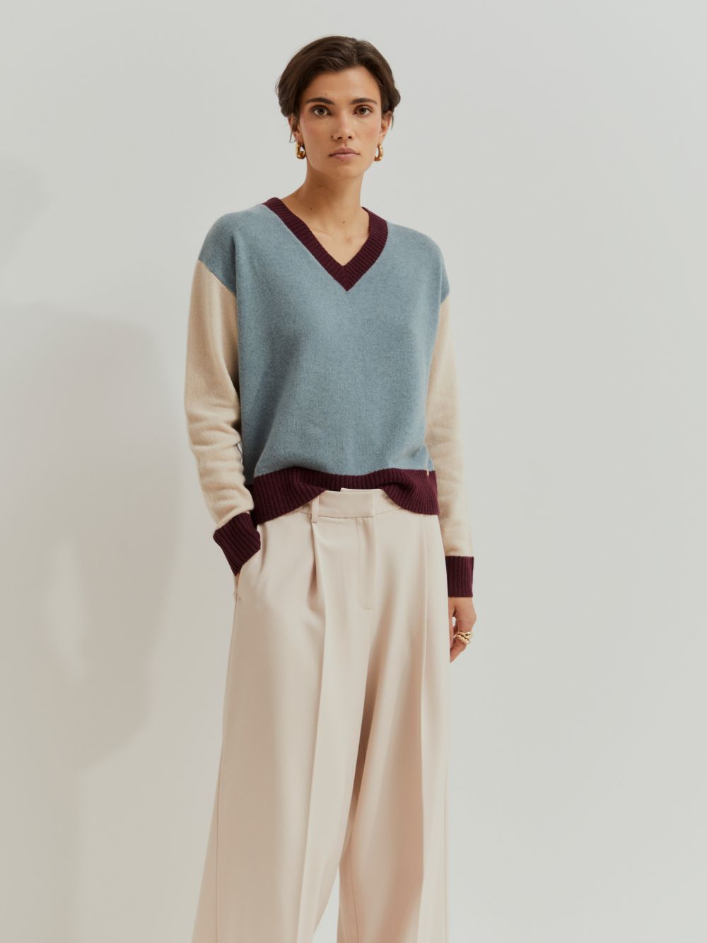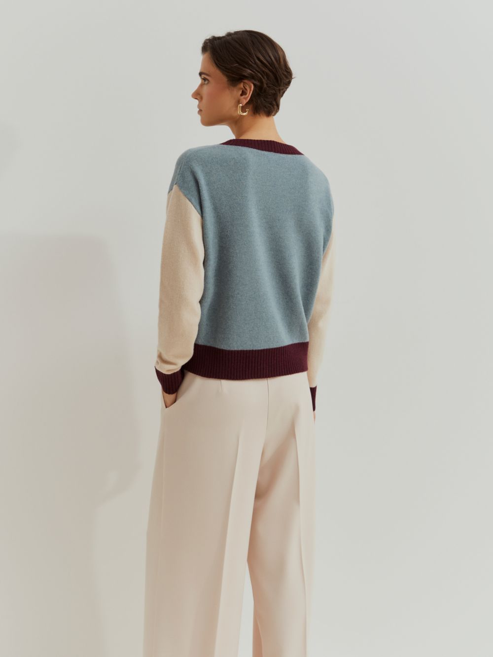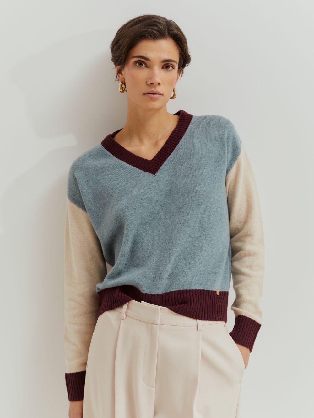Jersey tricolor de manga larga que combina un diseño moderno con una comodidad atemporal. El escote en V realza el look y permite combinaciones versátiles, desde looks informales hasta conjuntos más elegantes. Suave y cómodo, es perfecto para afrontar los días más frescos con encanto y personalidad.. Color azul claro, crudo y berenjena.