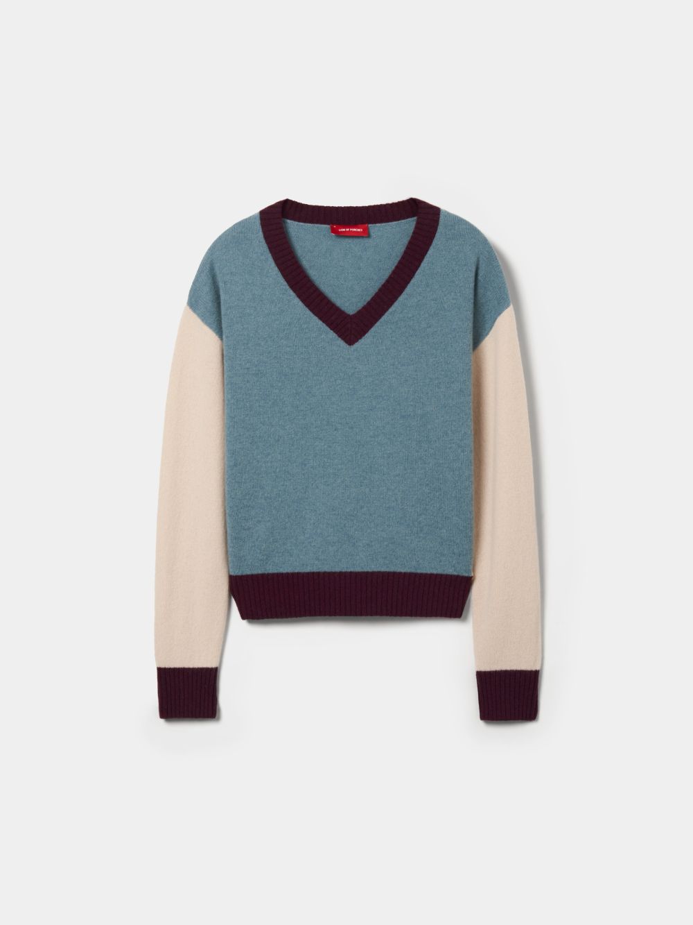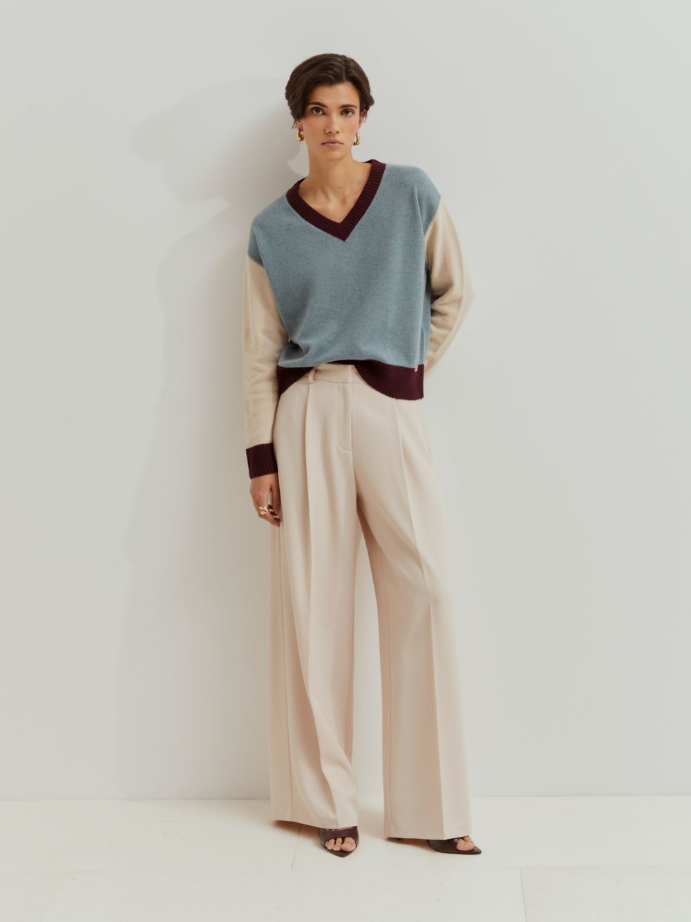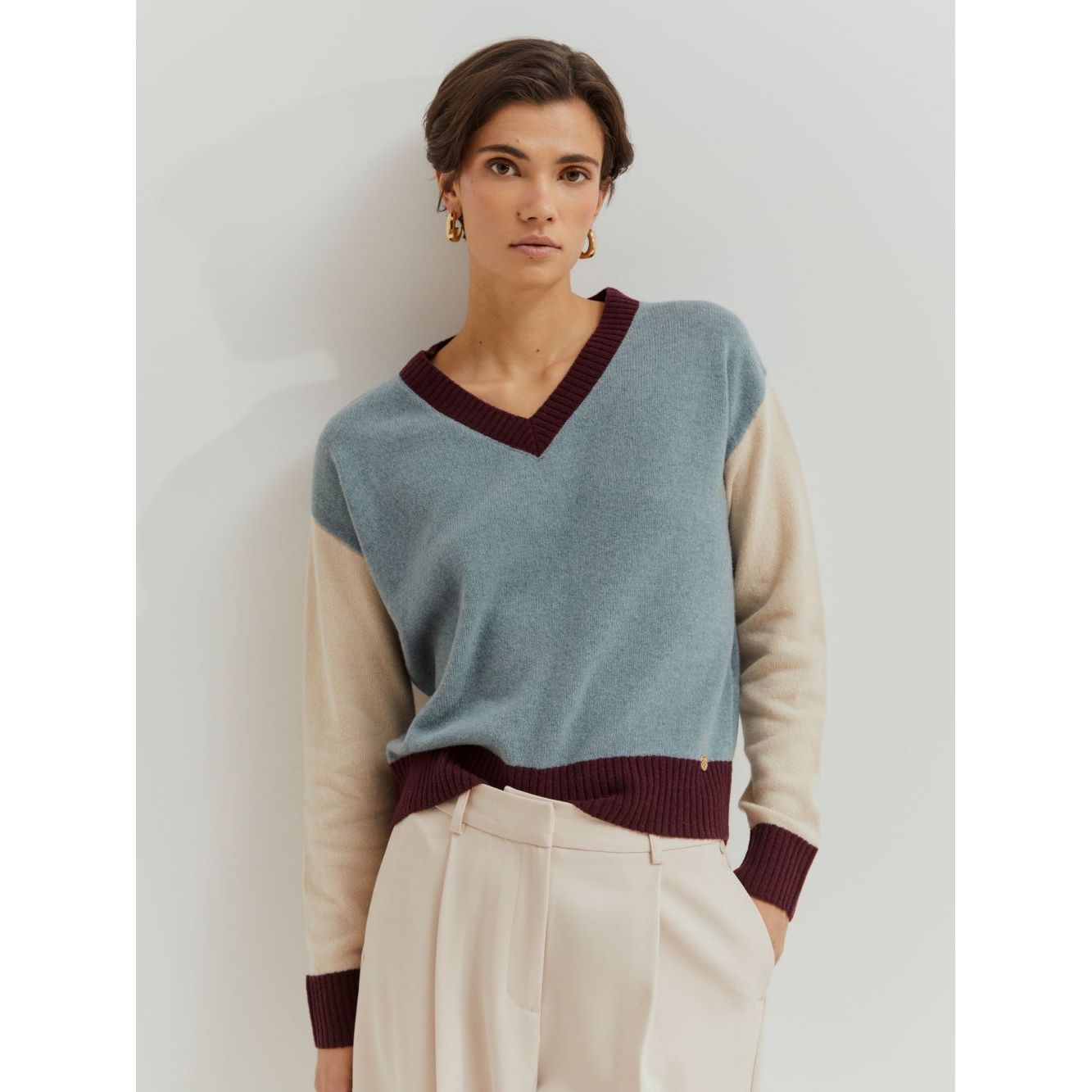 Jersey tricolor de manga larga que combina un diseño moderno con una comodidad atemporal. El escote en V realza el look y permite combinaciones versátiles, desde looks informales hasta conjuntos más elegantes. Suave y cómodo, es perfecto para afrontar los días más frescos con encanto y personalidad.. Color azul claro, crudo y berenjena.