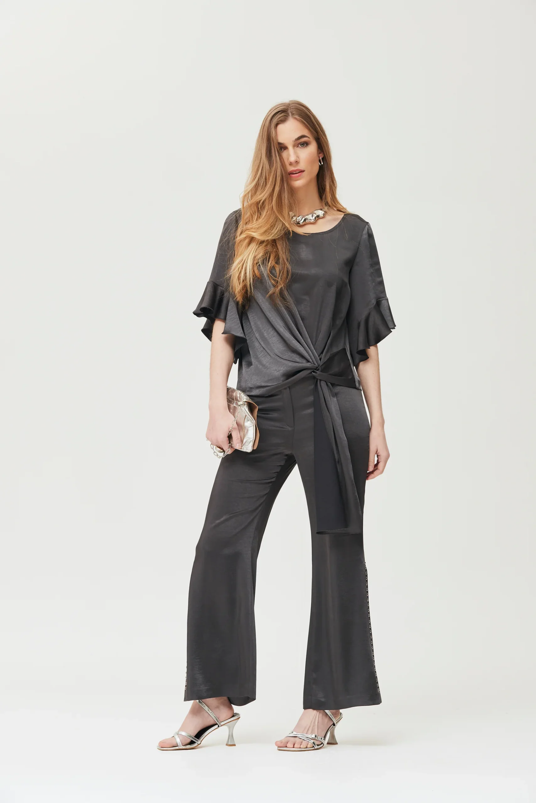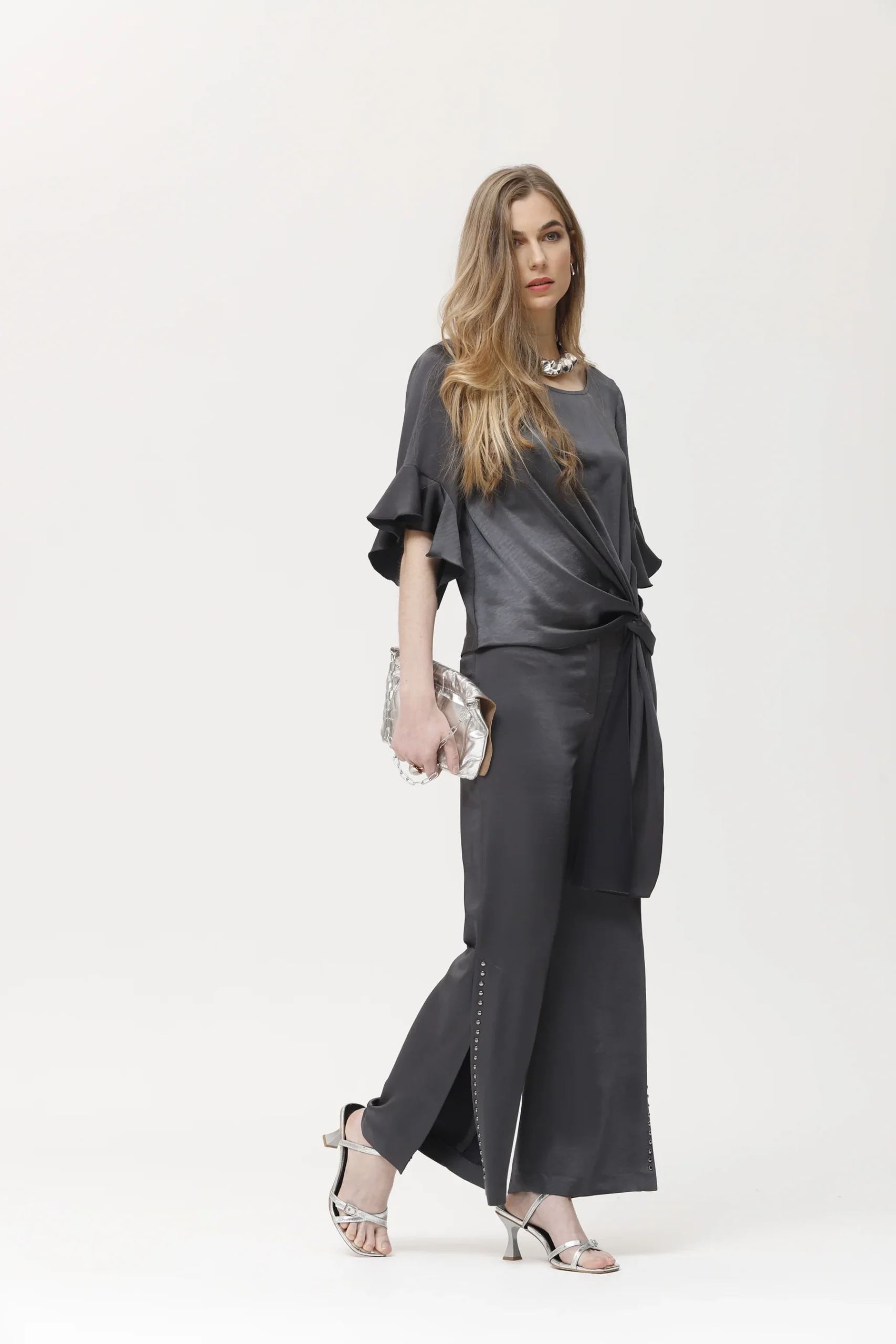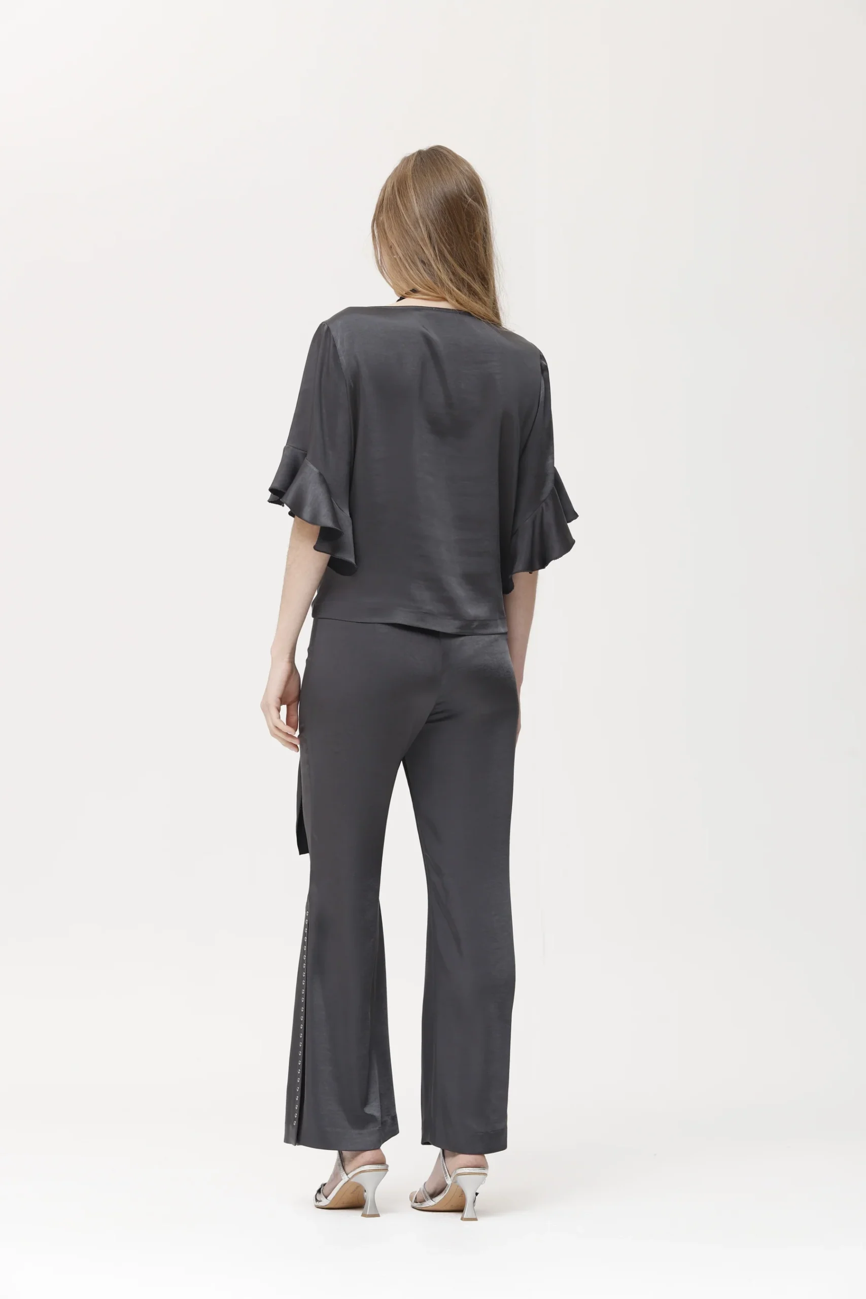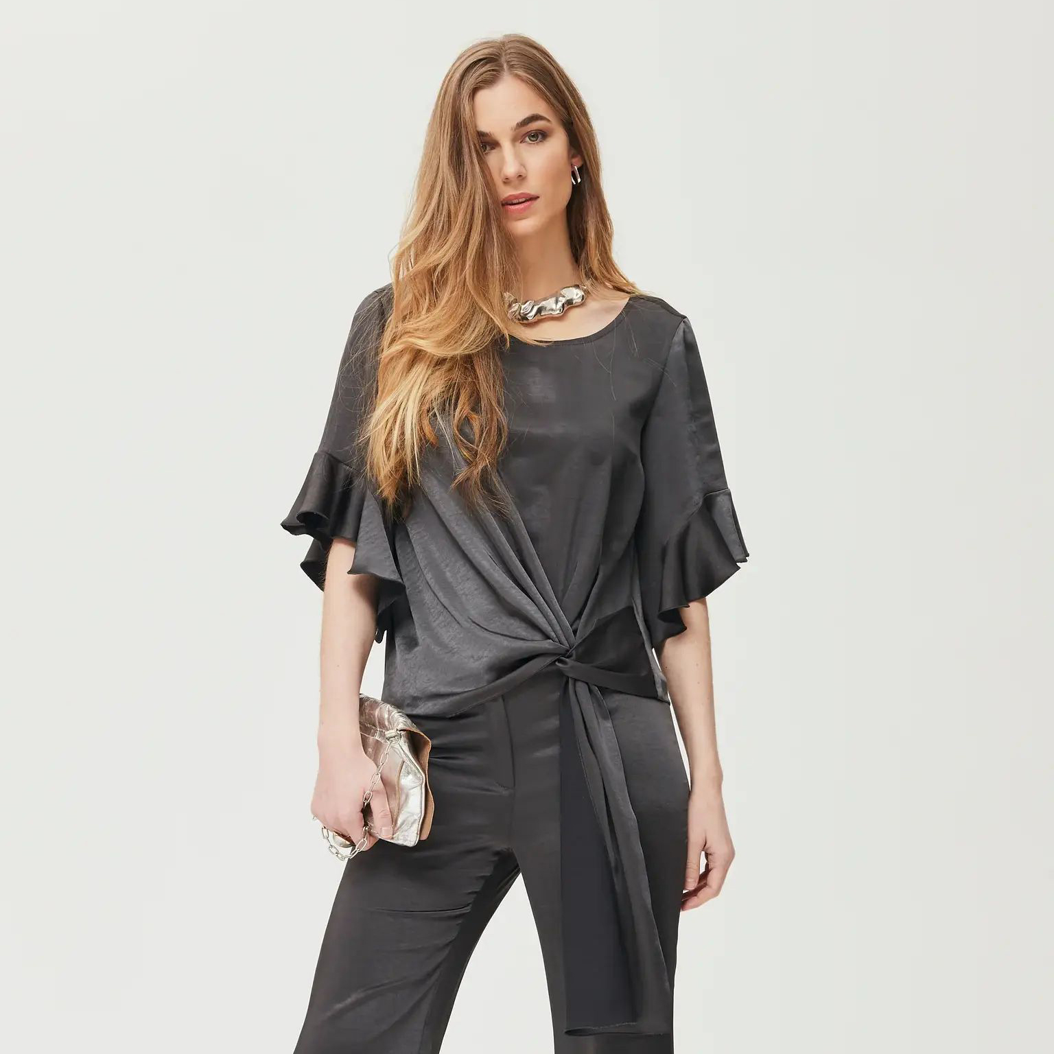 Top en raso gris antracita con acabado satinado y tacto suave. presenta manga corta con volantes y un diseño frontal con lazada, aportando movimiento y un toque sofisticado. el corte fluido y la caída ligera lo hacen ideal para estilismos de invitada, cenas o eventos especiales, y puede combinarse tanto con pantalones como con faldas para crear conjuntos versátiles y elegantes. su brillo discreto y diseño femenino realzan cualquier look de noche. Color gris-antracita.