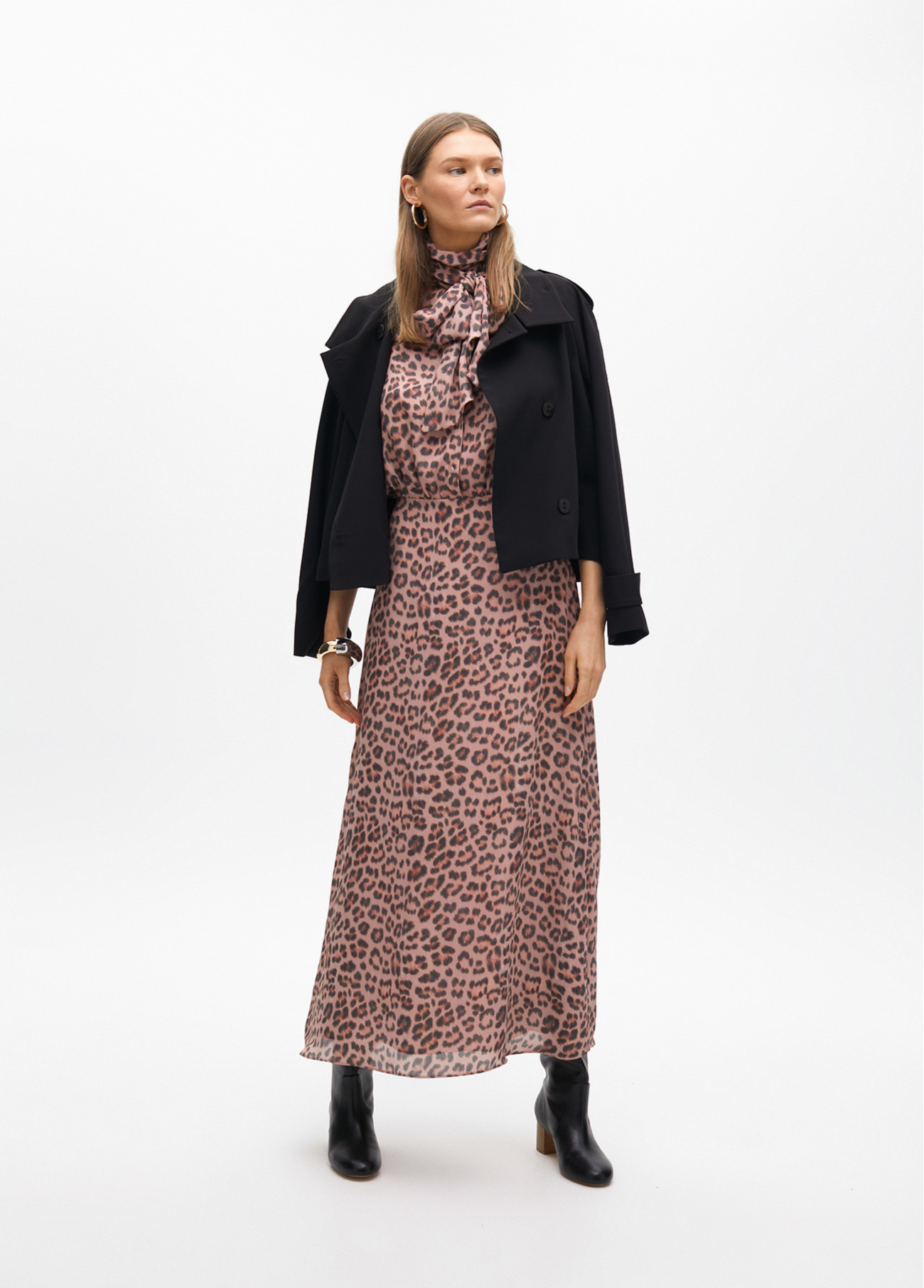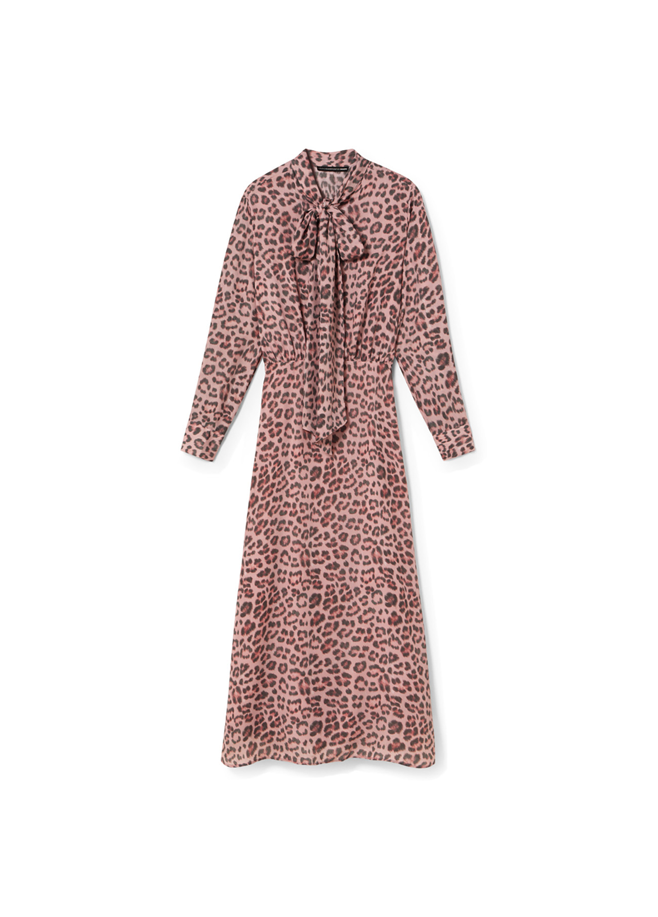 Vestido largo estampado animal print con elegante lazada en el cuello. Confeccionado en tejido ligero para un ajuste cómodo. Mangas largas fruncidas en los puños.Color rosa nude y marrón.
